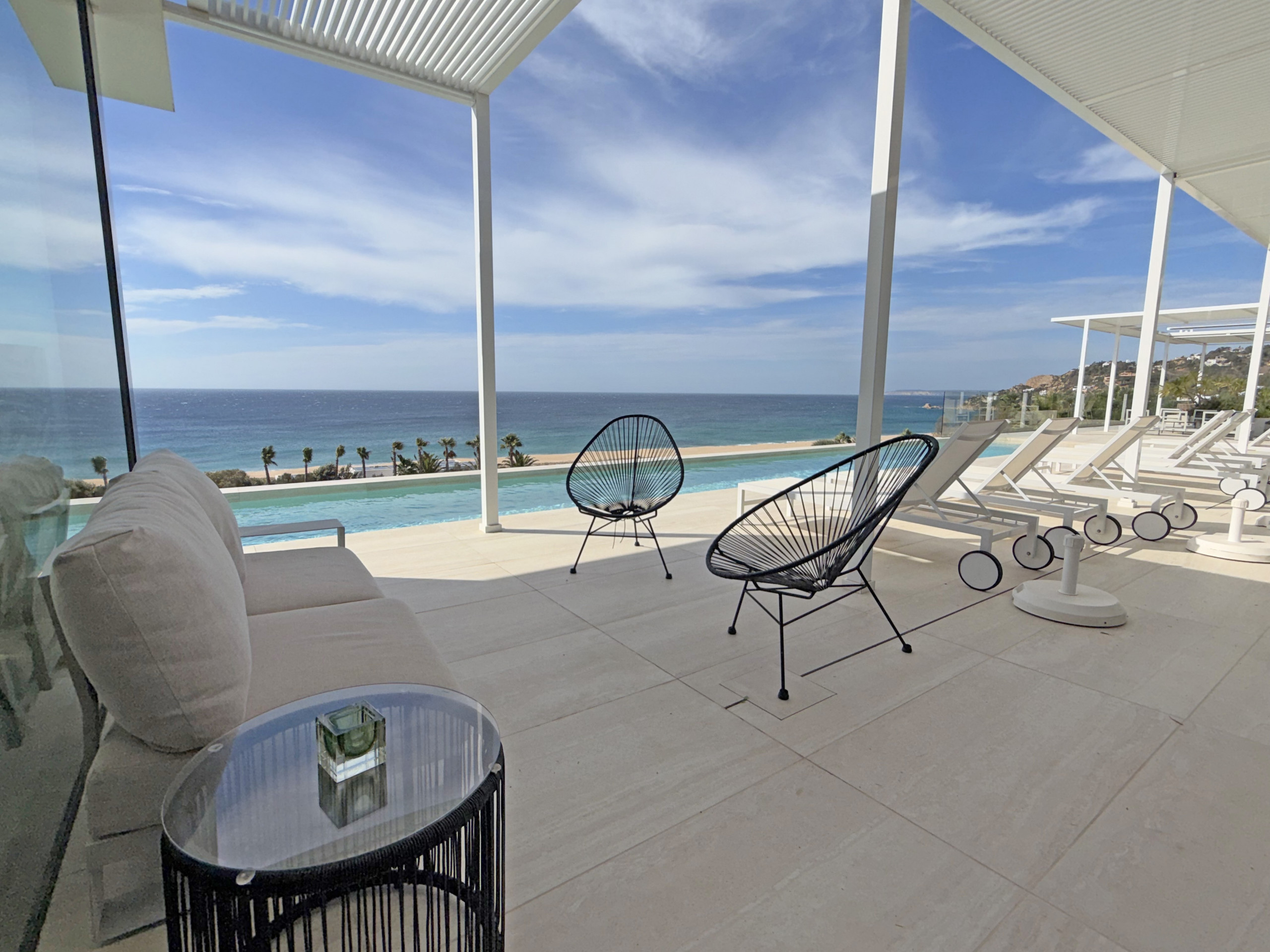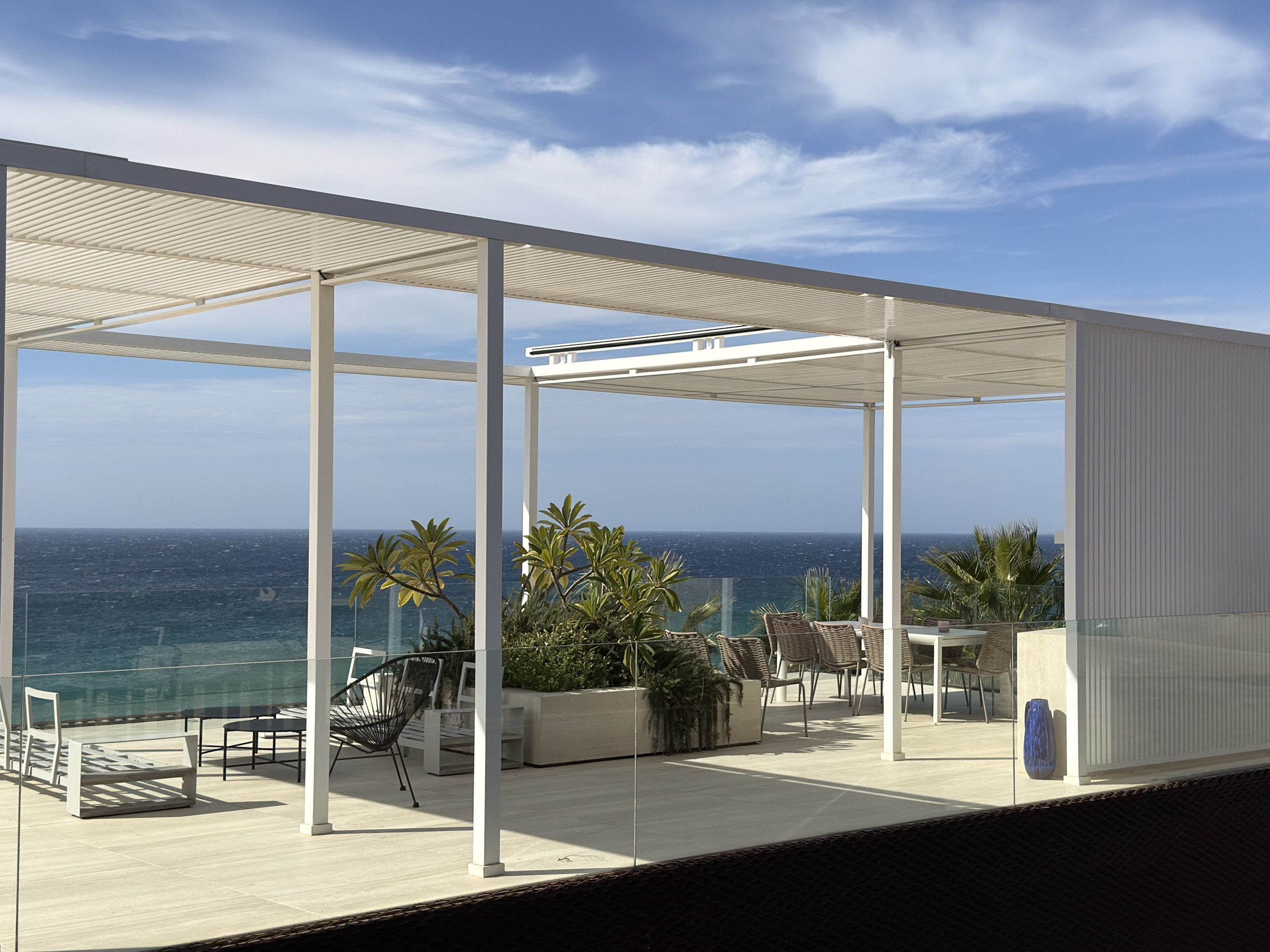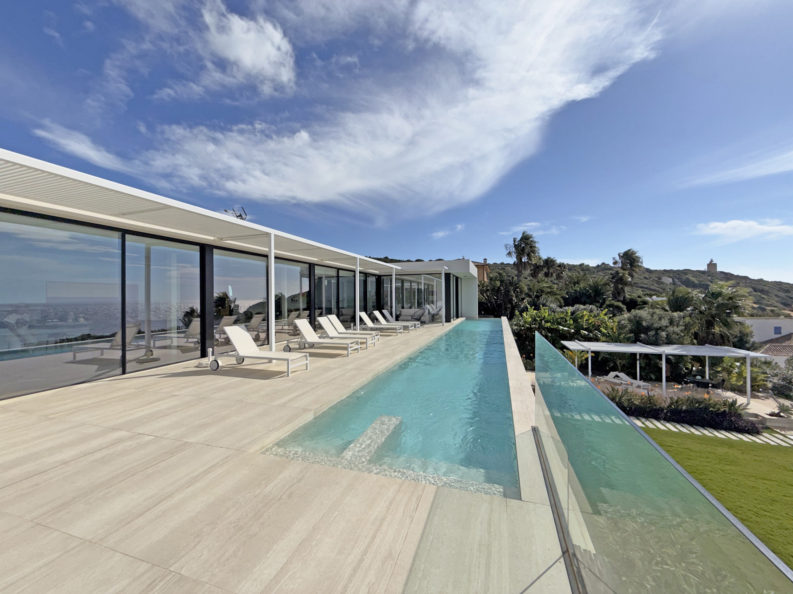 Terraza Principal: Piscina y Cocina Exterior: Un paraíso al aire libre con la zona de piscina con vistas infinitas, desbordante y 23 m. de largo. Además, la terraza dispone de numerosas tumbonas para tomar el sol y una completa cocina exterior con barbacoa y comedor, ideal para disfrutar de comidas gourmet bajo el cielo de Atlanterra.