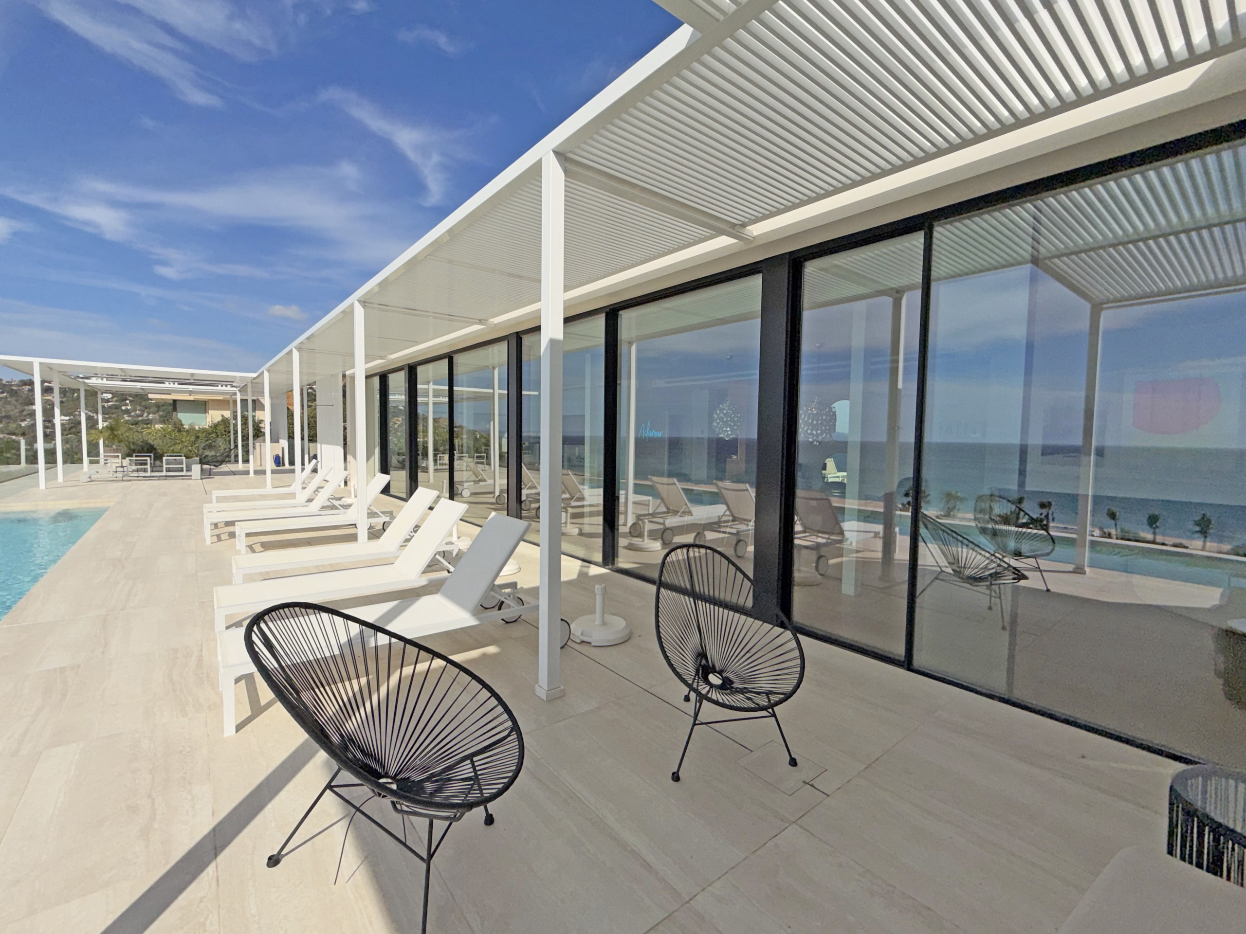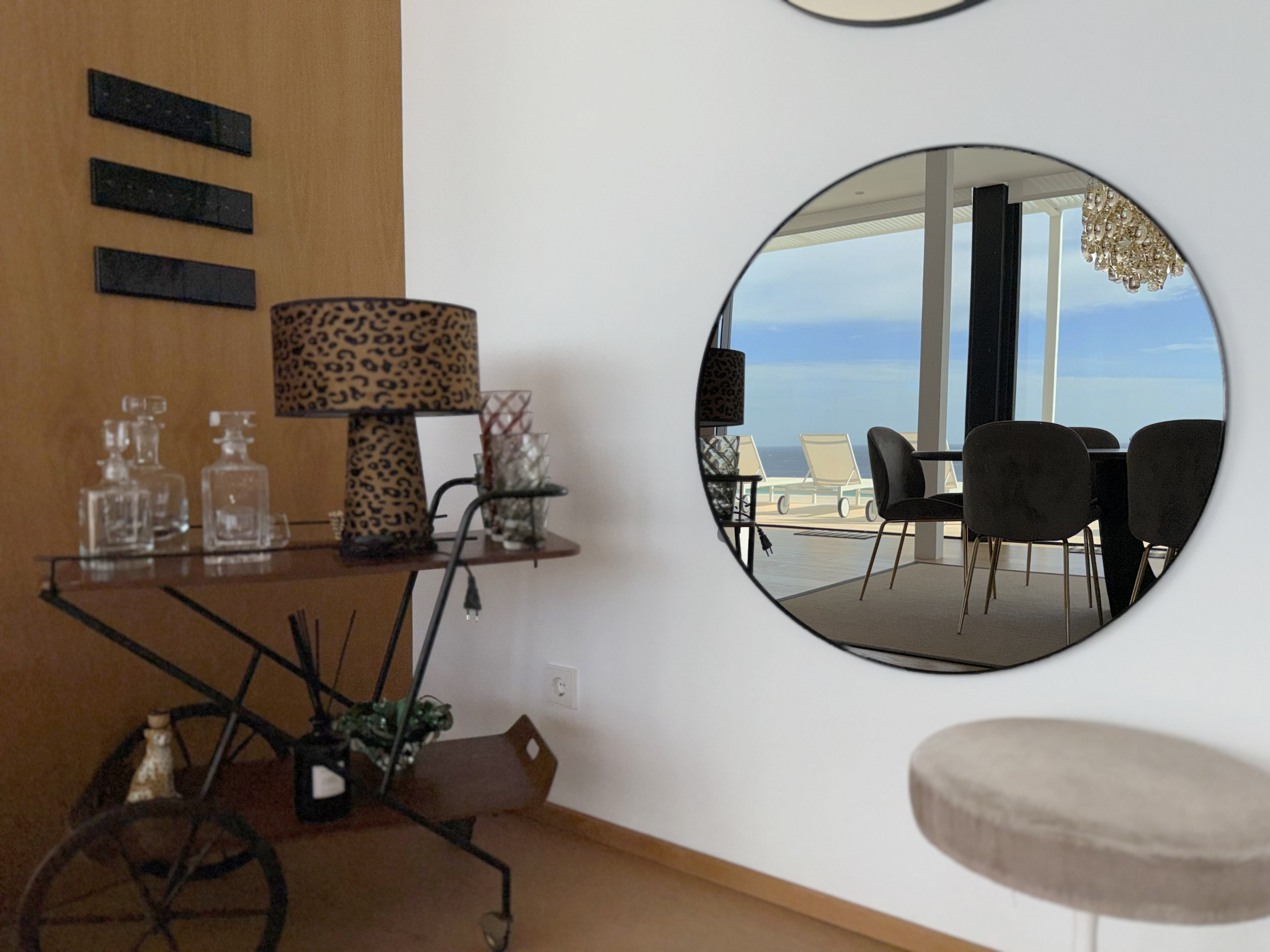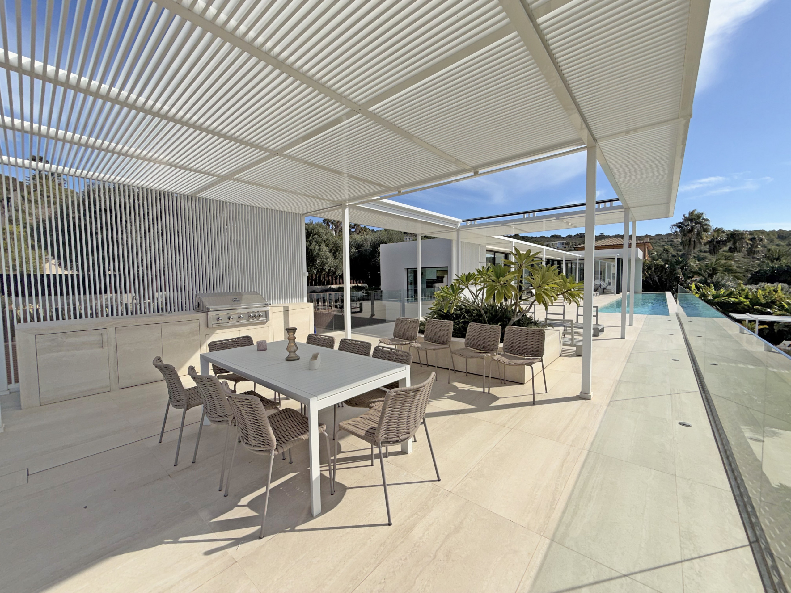 Terraza Principal: Piscina y Cocina Exterior: Un paraíso al aire libre con la zona de piscina con vistas infinitas, desbordante y 23 m. de largo. Además, la terraza dispone de numerosas tumbonas para tomar el sol y una completa cocina exterior con barbacoa y comedor, ideal para disfrutar de comidas gourmet bajo el cielo de Atlanterra.