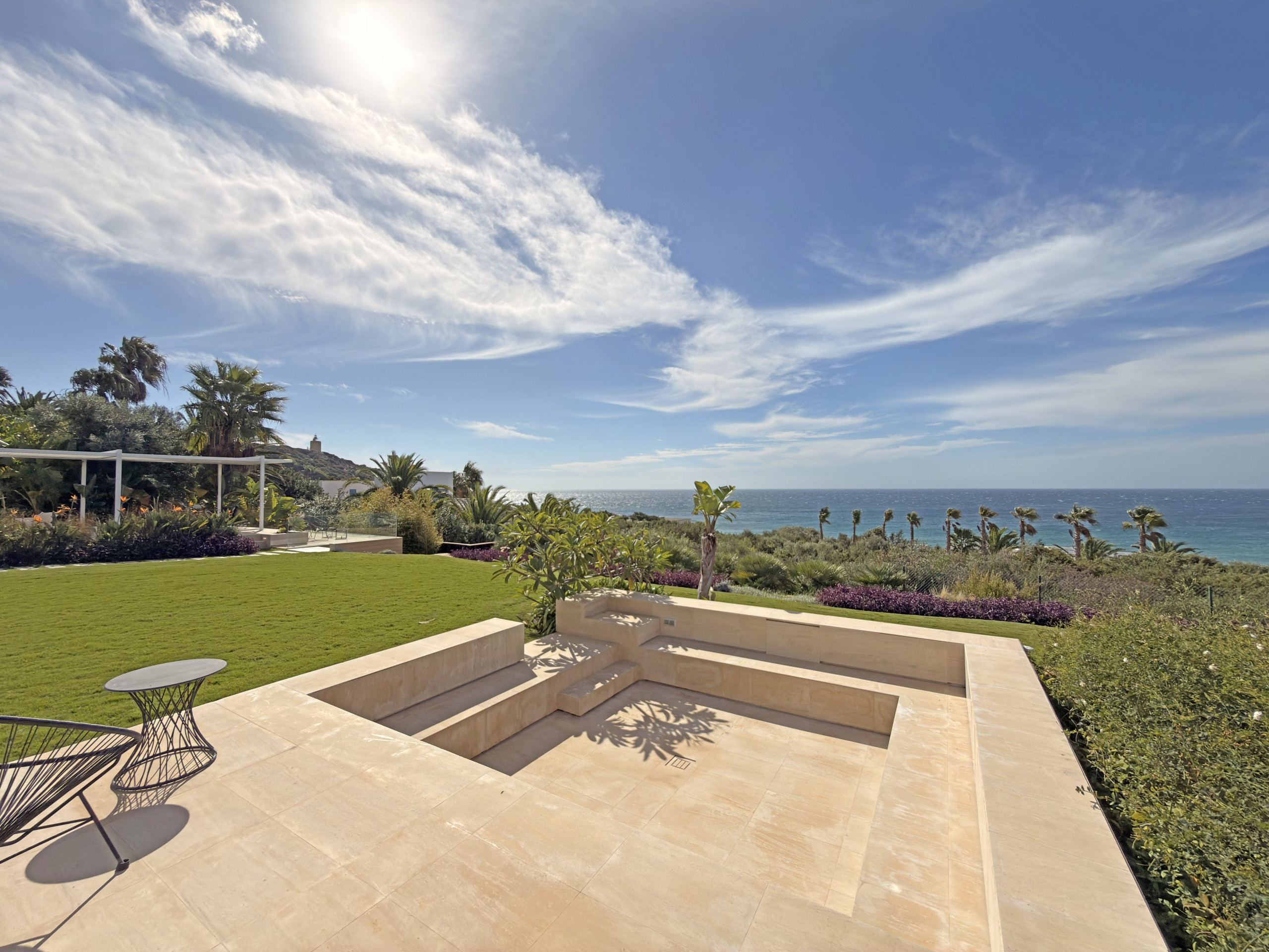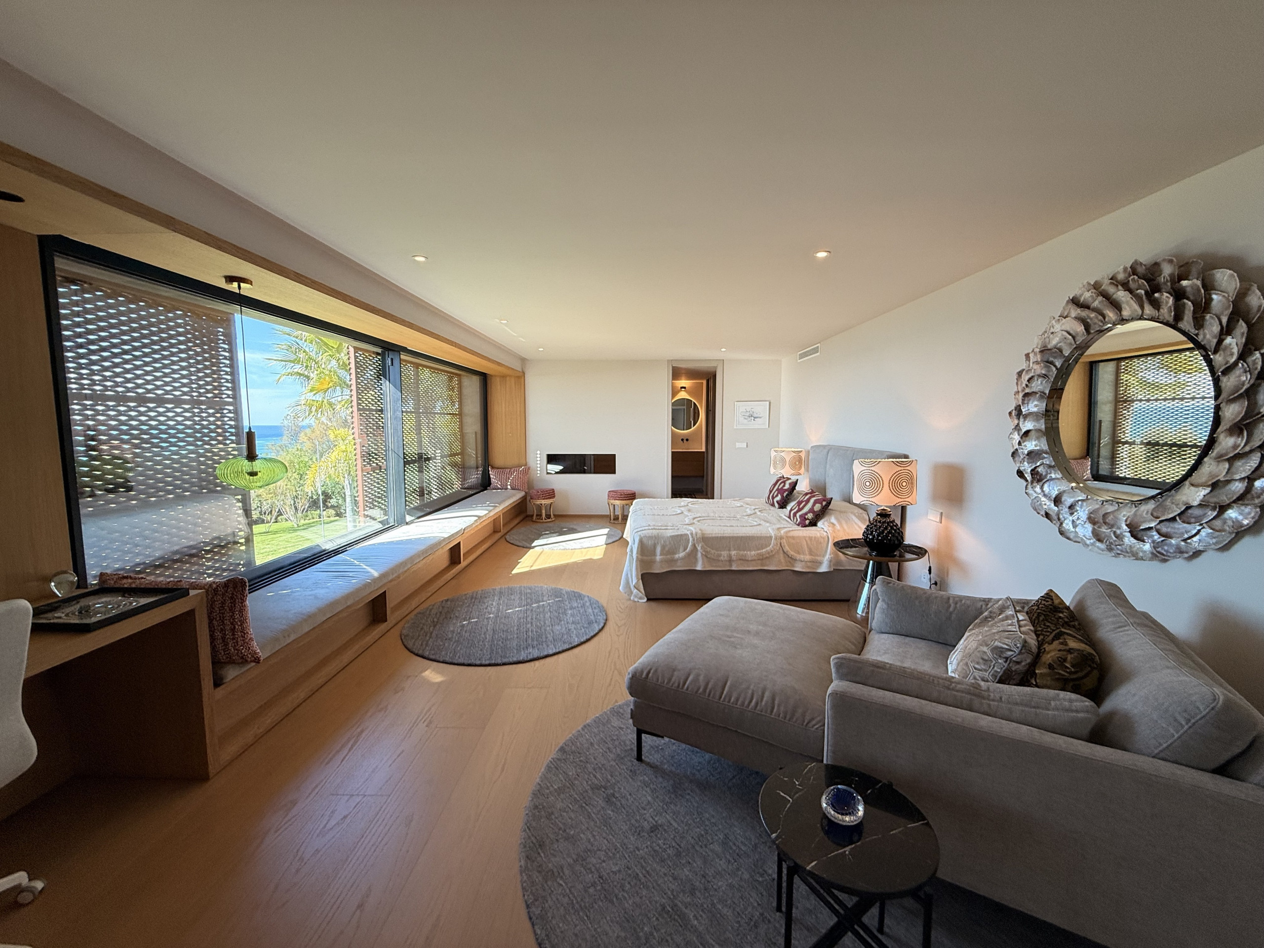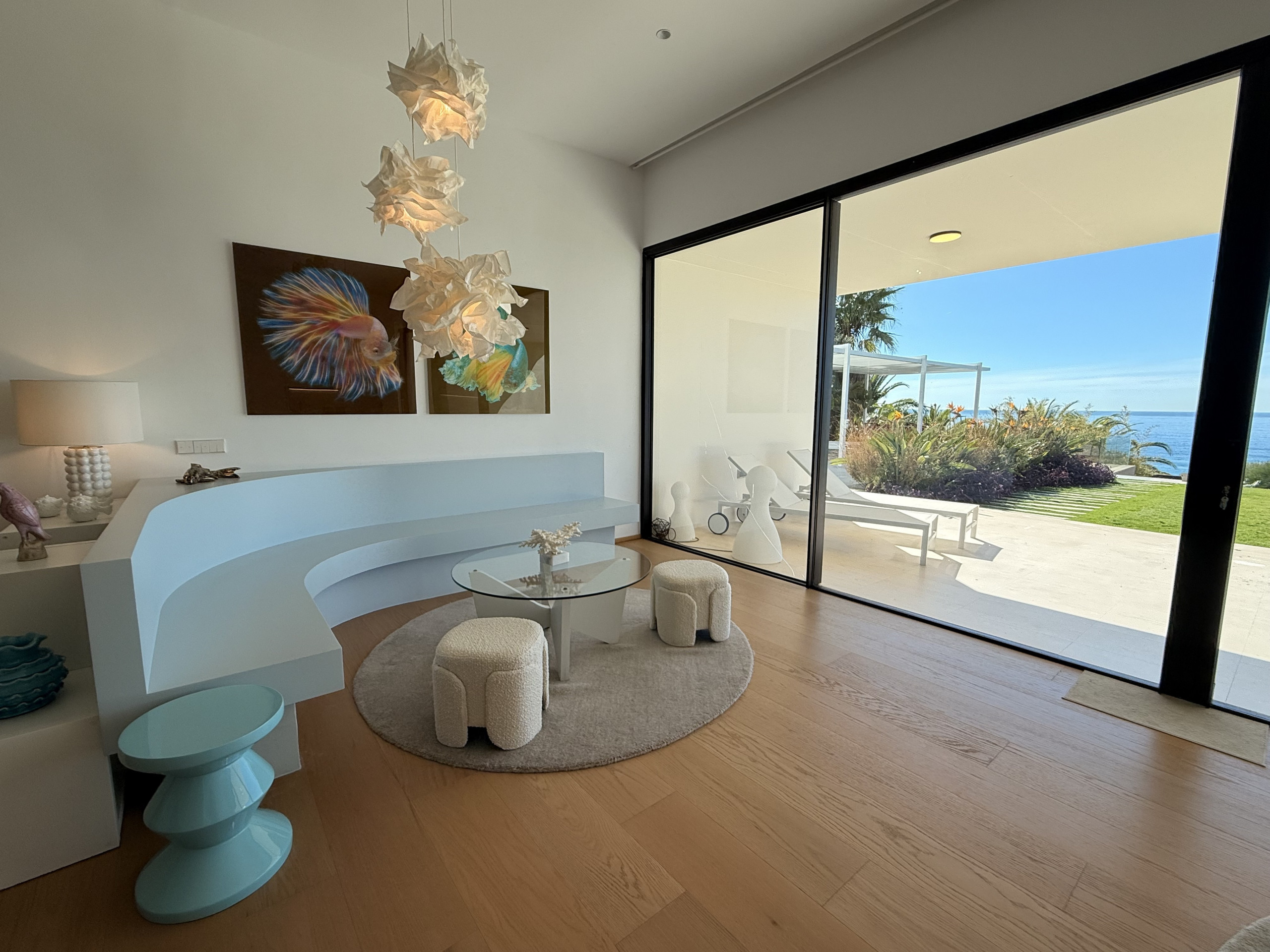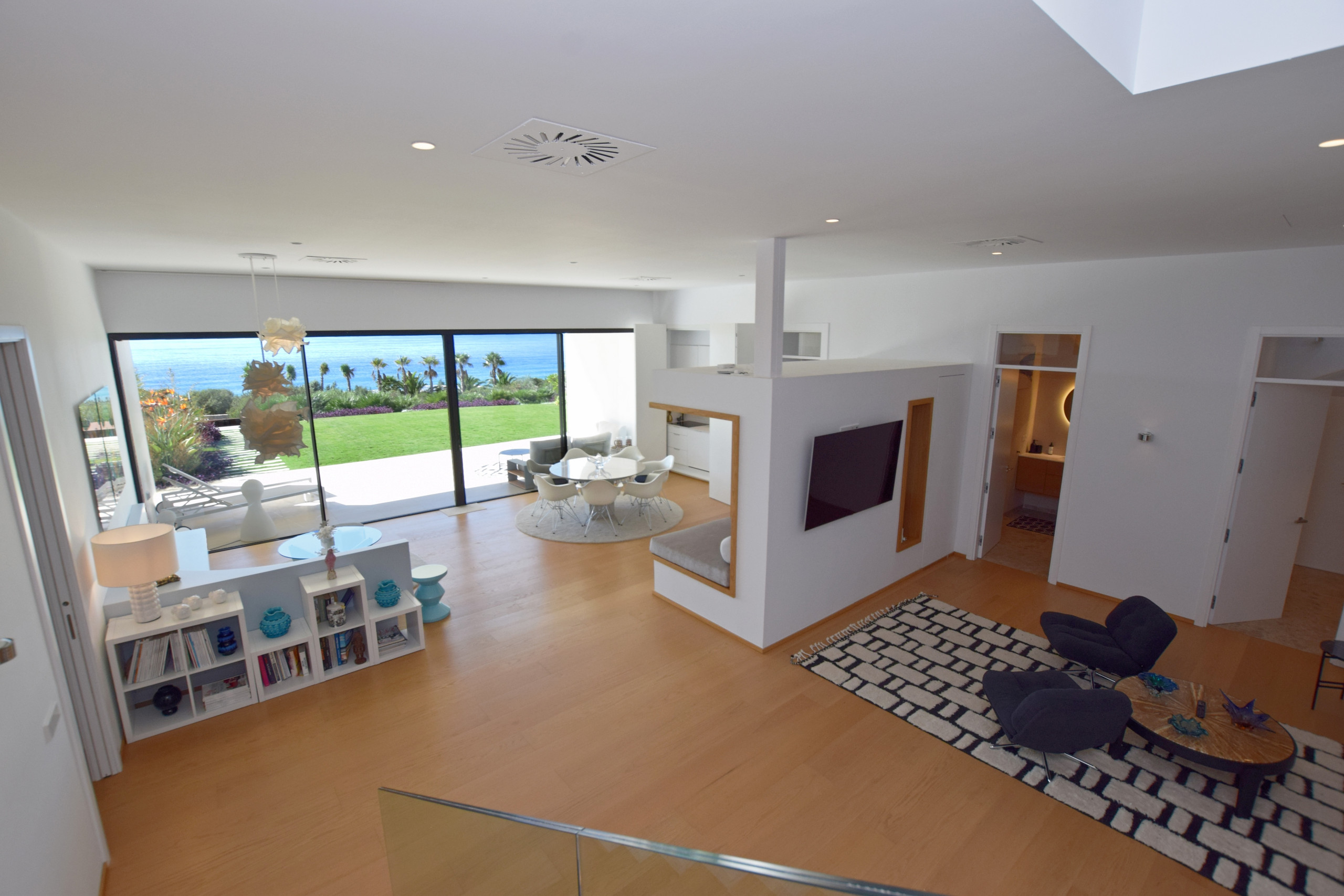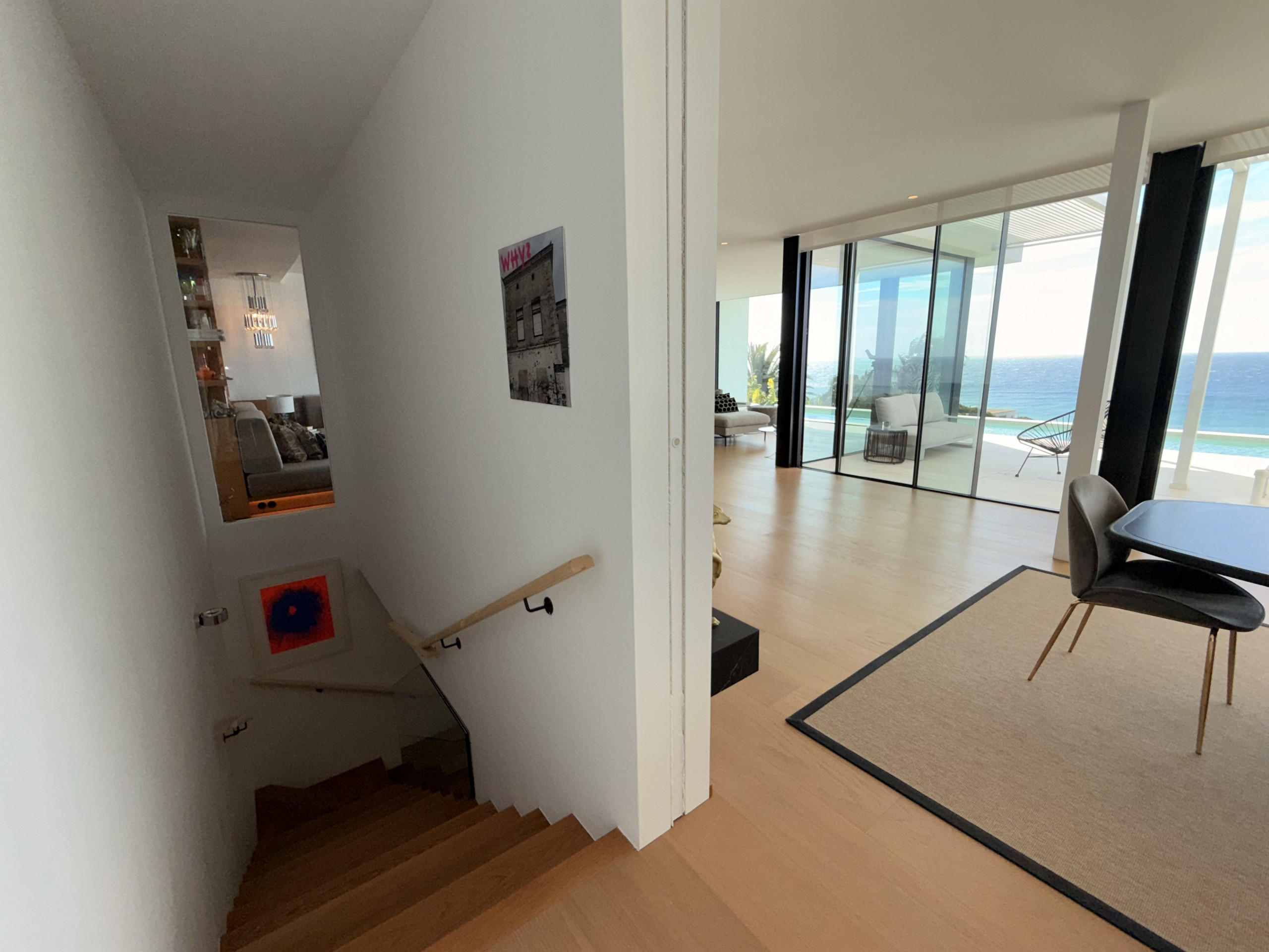 Accede a la planta inferior a través de una elegante escalera. Esta planta está inteligentemente distribuida para ofrecer privacidad y diferentes áreas de esparcimiento, todas ellas conectadas al exuberante jardín y al mar.
