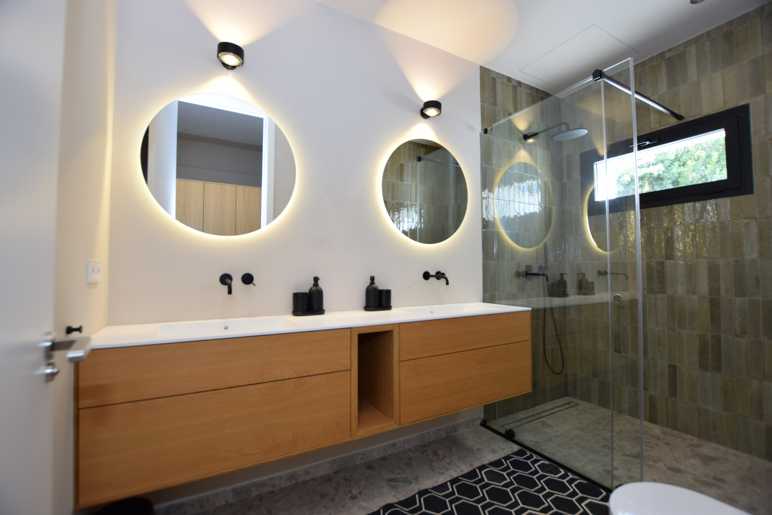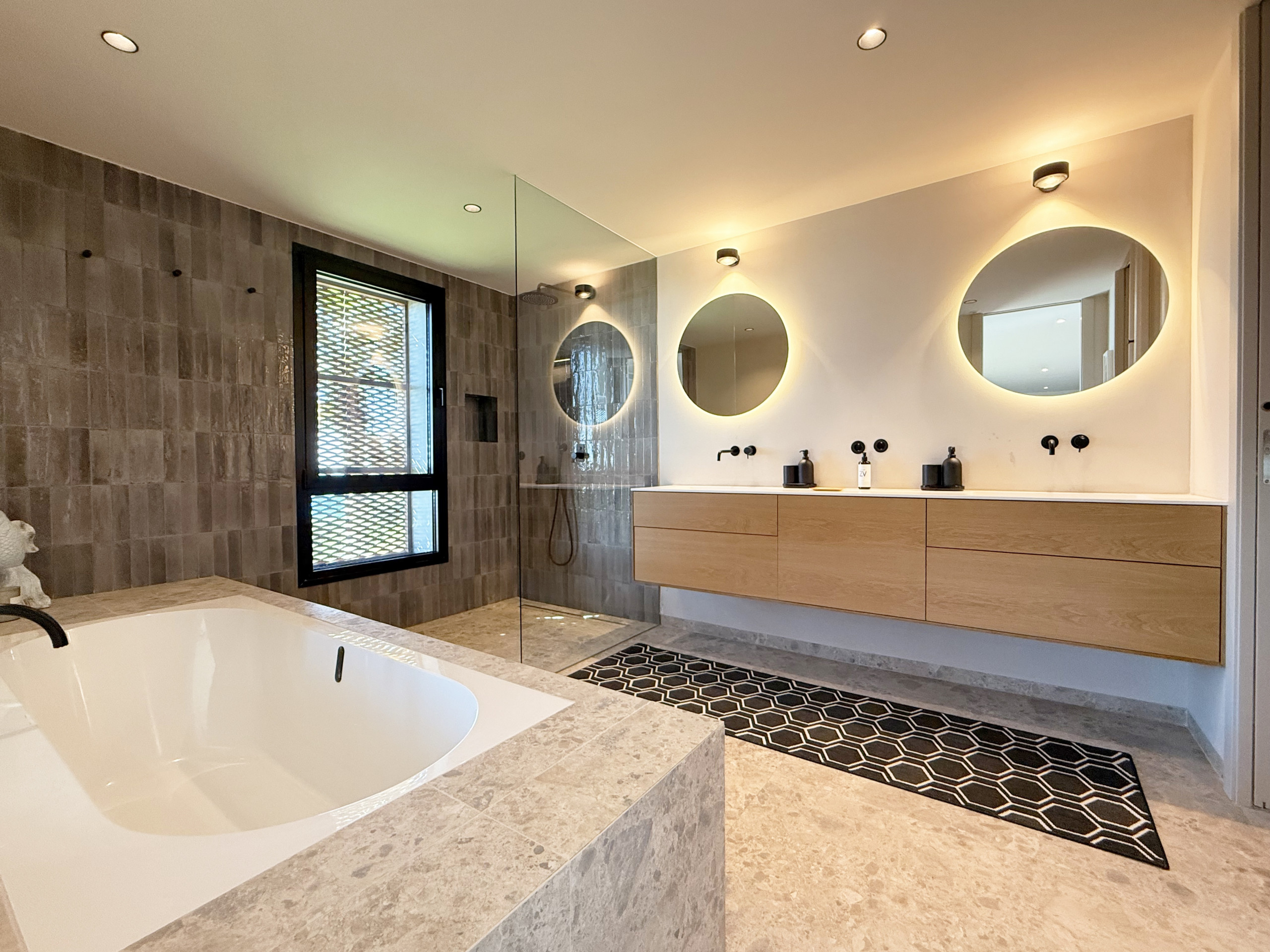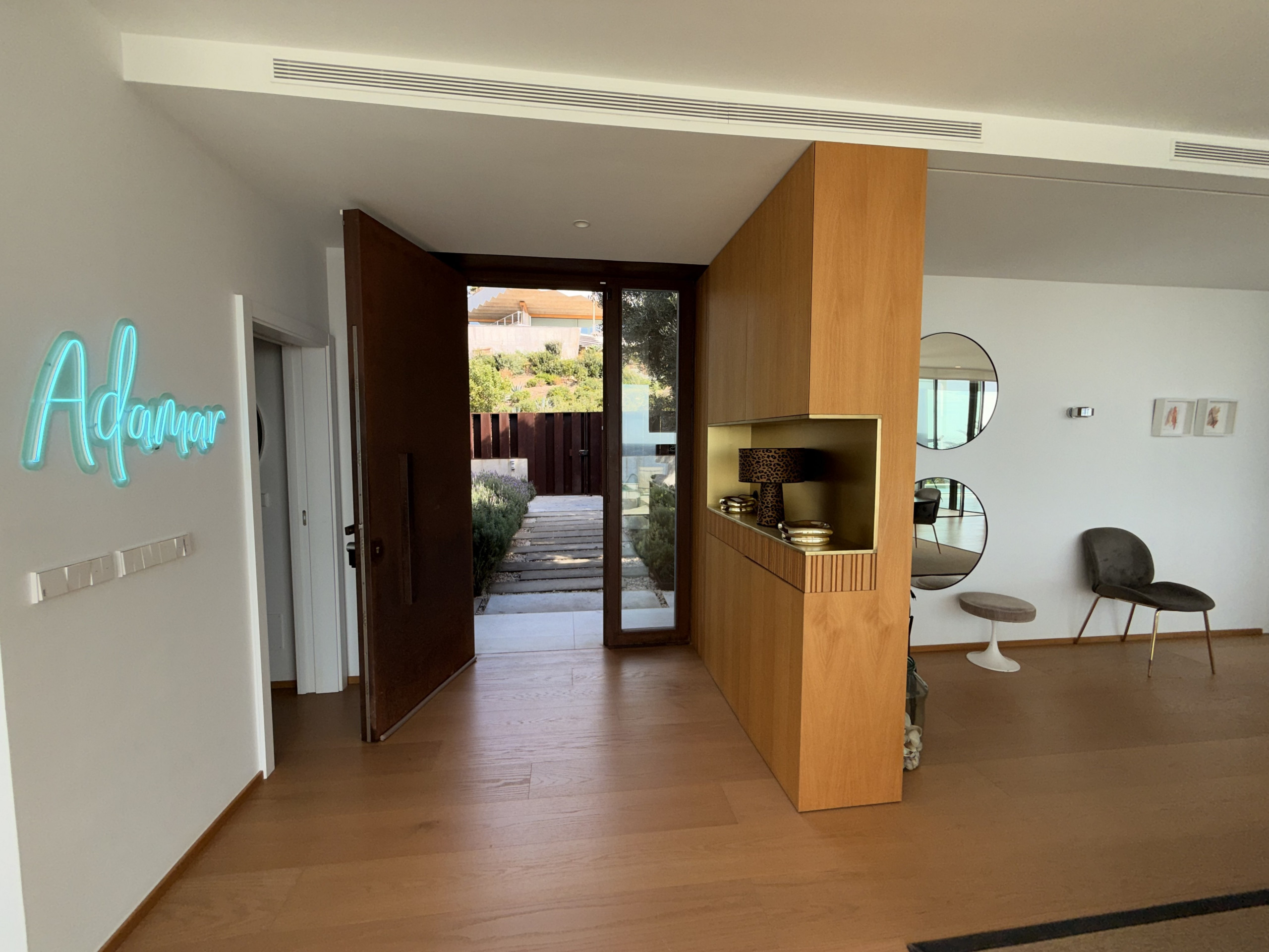 Toda la casa dispone de un sofisticado sistema de aire acondicionado que mantiene la temperatura interior estable y eficiente, además de calefacción por suelo radiante.