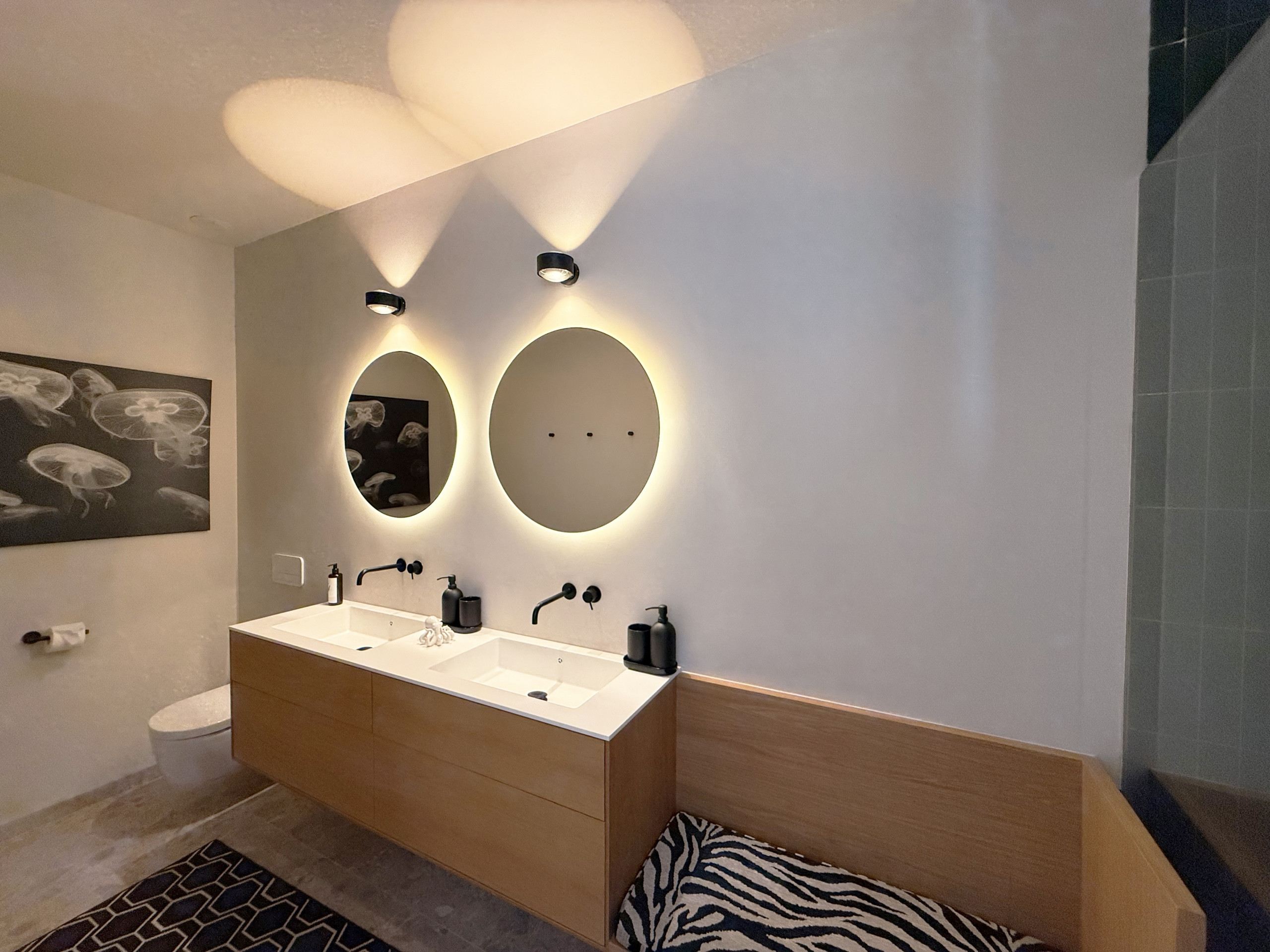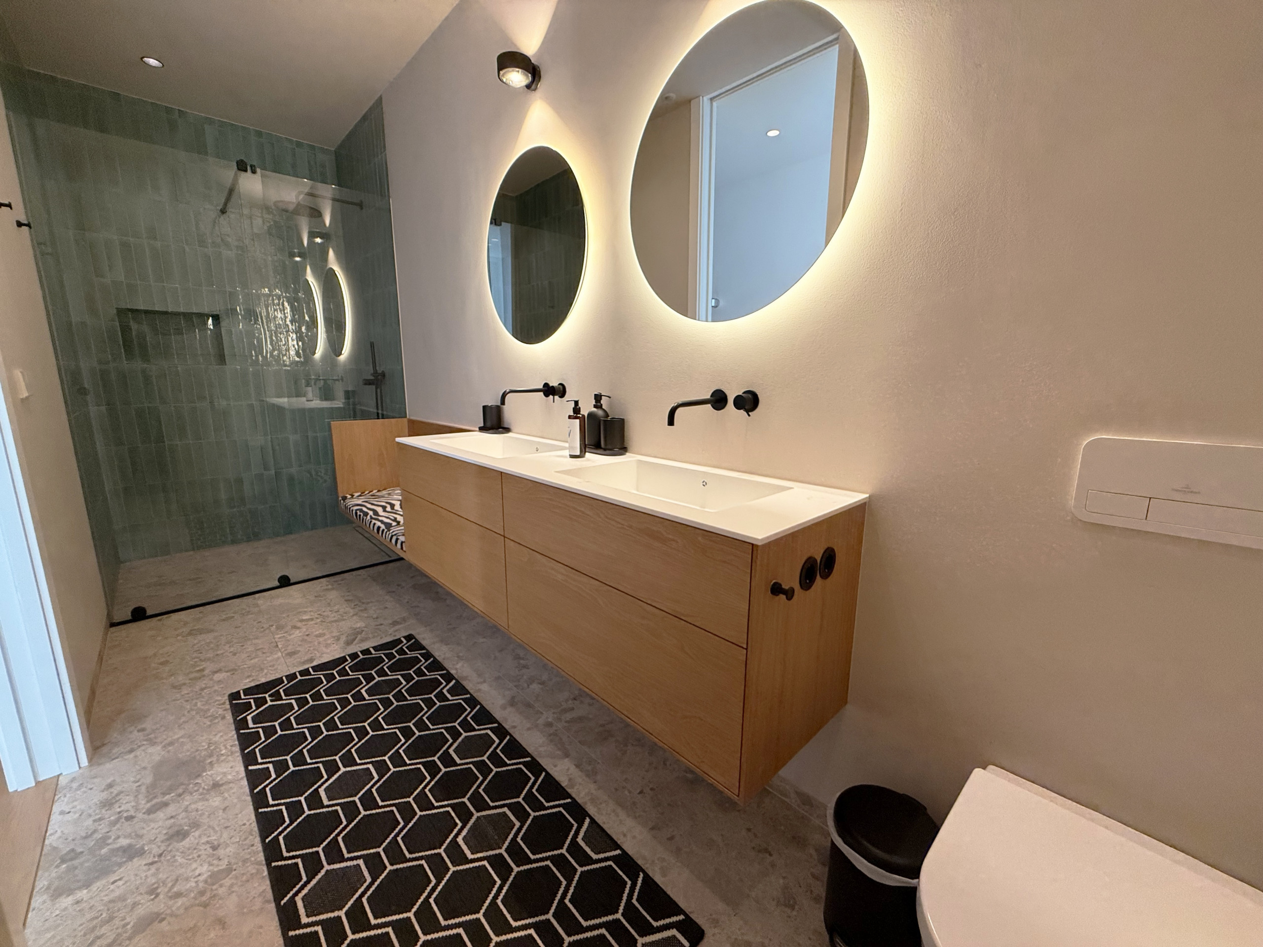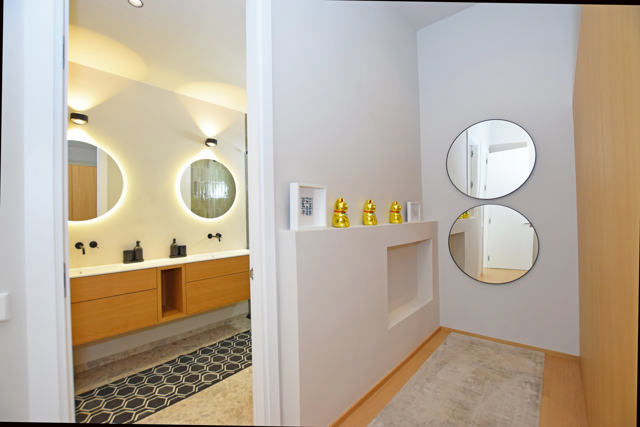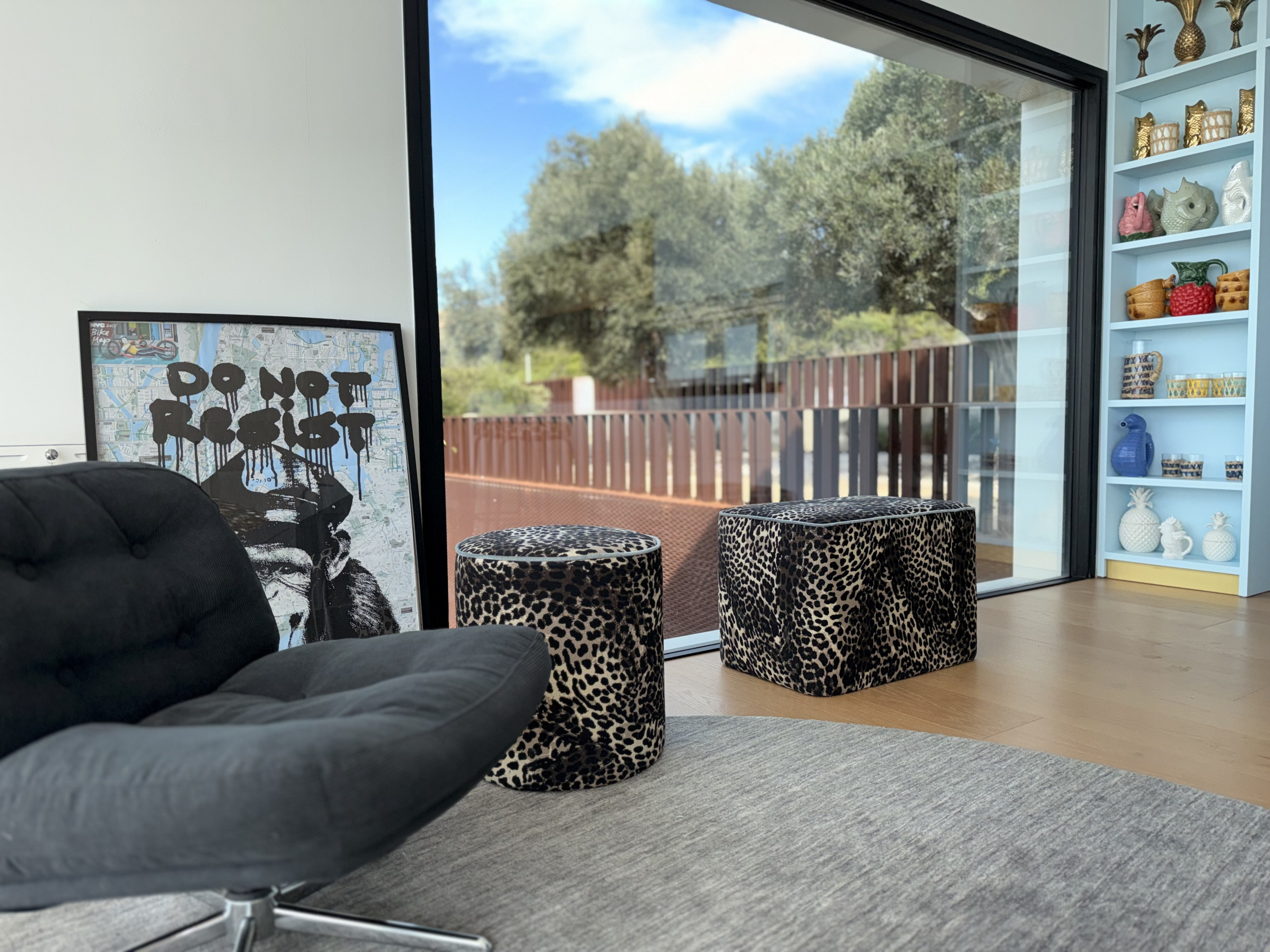 Toda la casa dispone de un sofisticado sistema de aire acondicionado que mantiene la temperatura interior estable y eficiente, además de calefacción por suelo radiante.