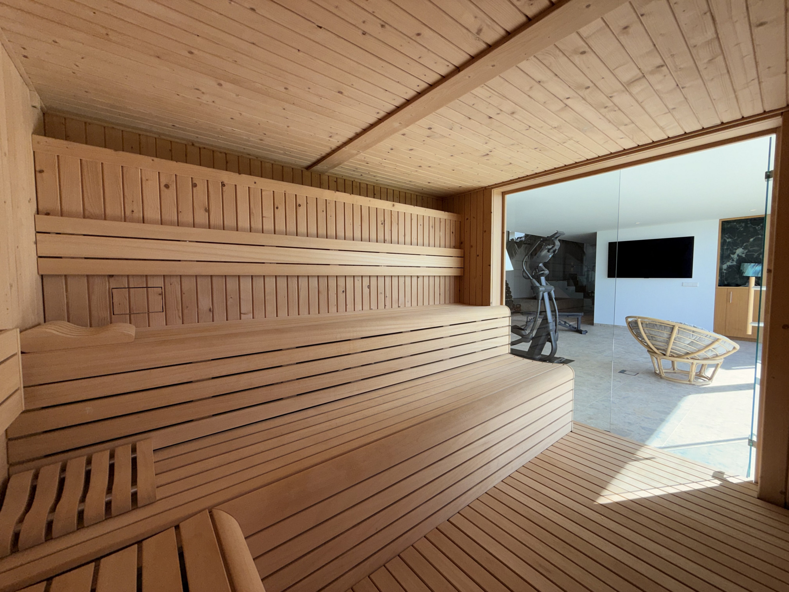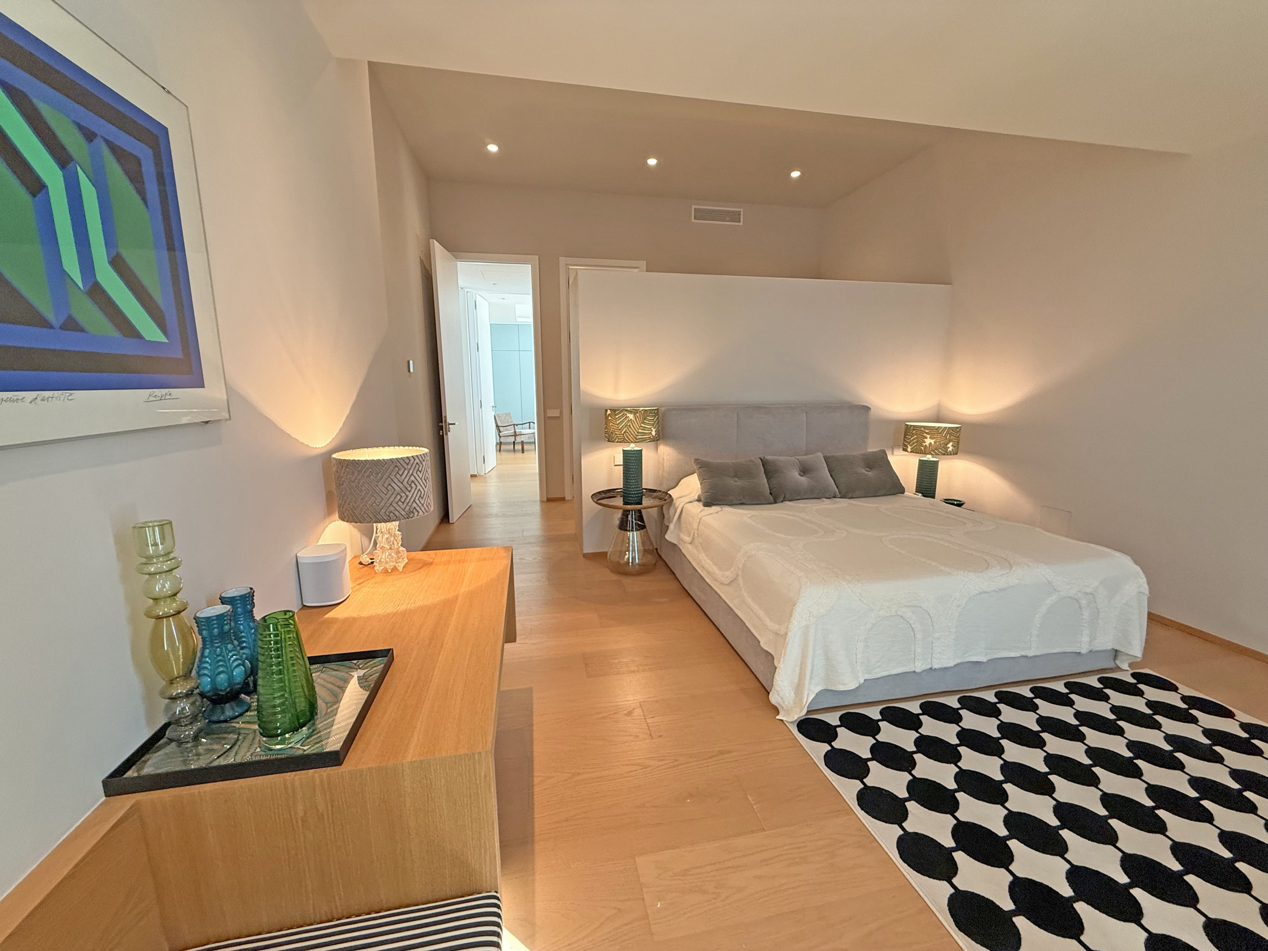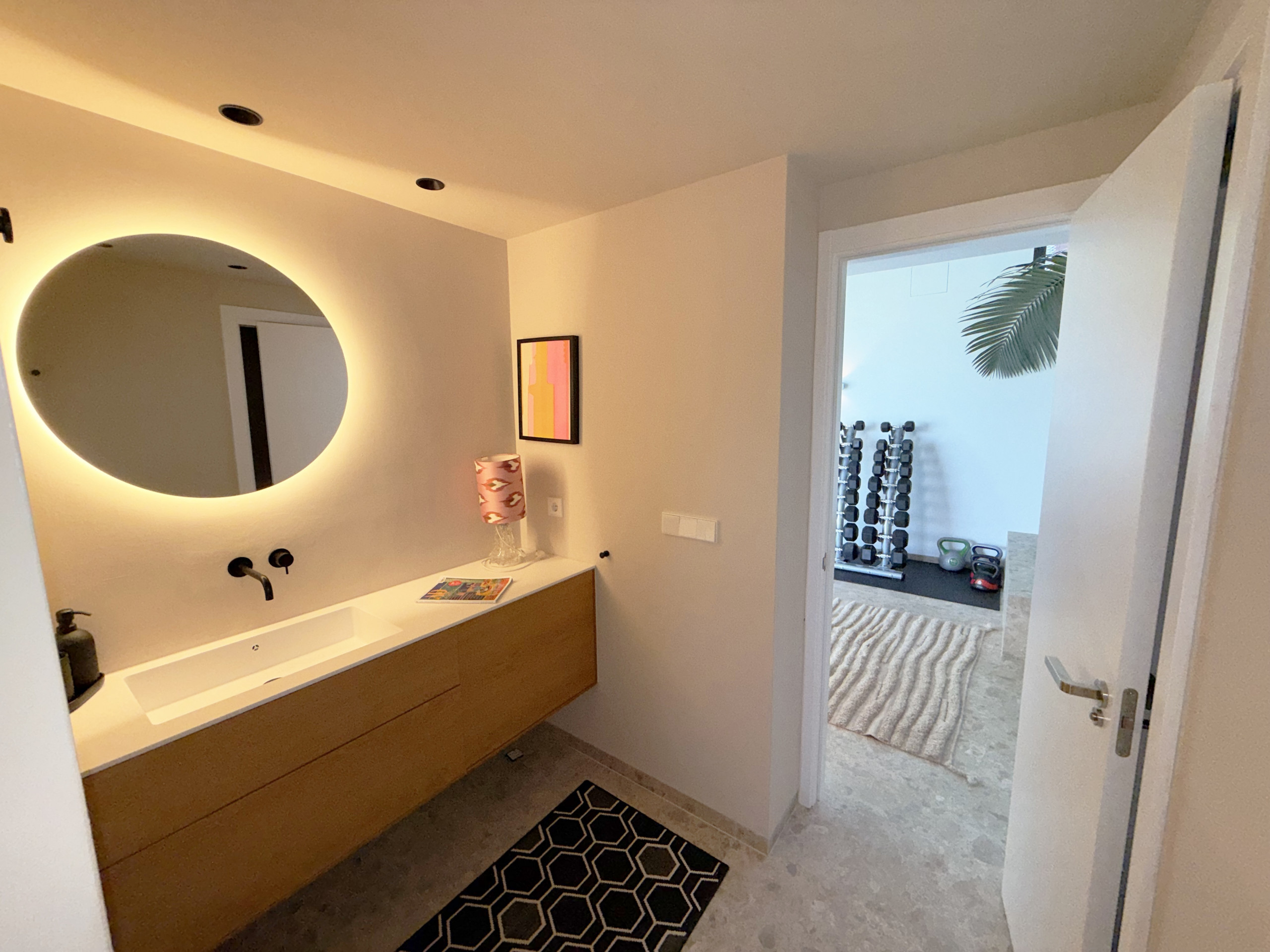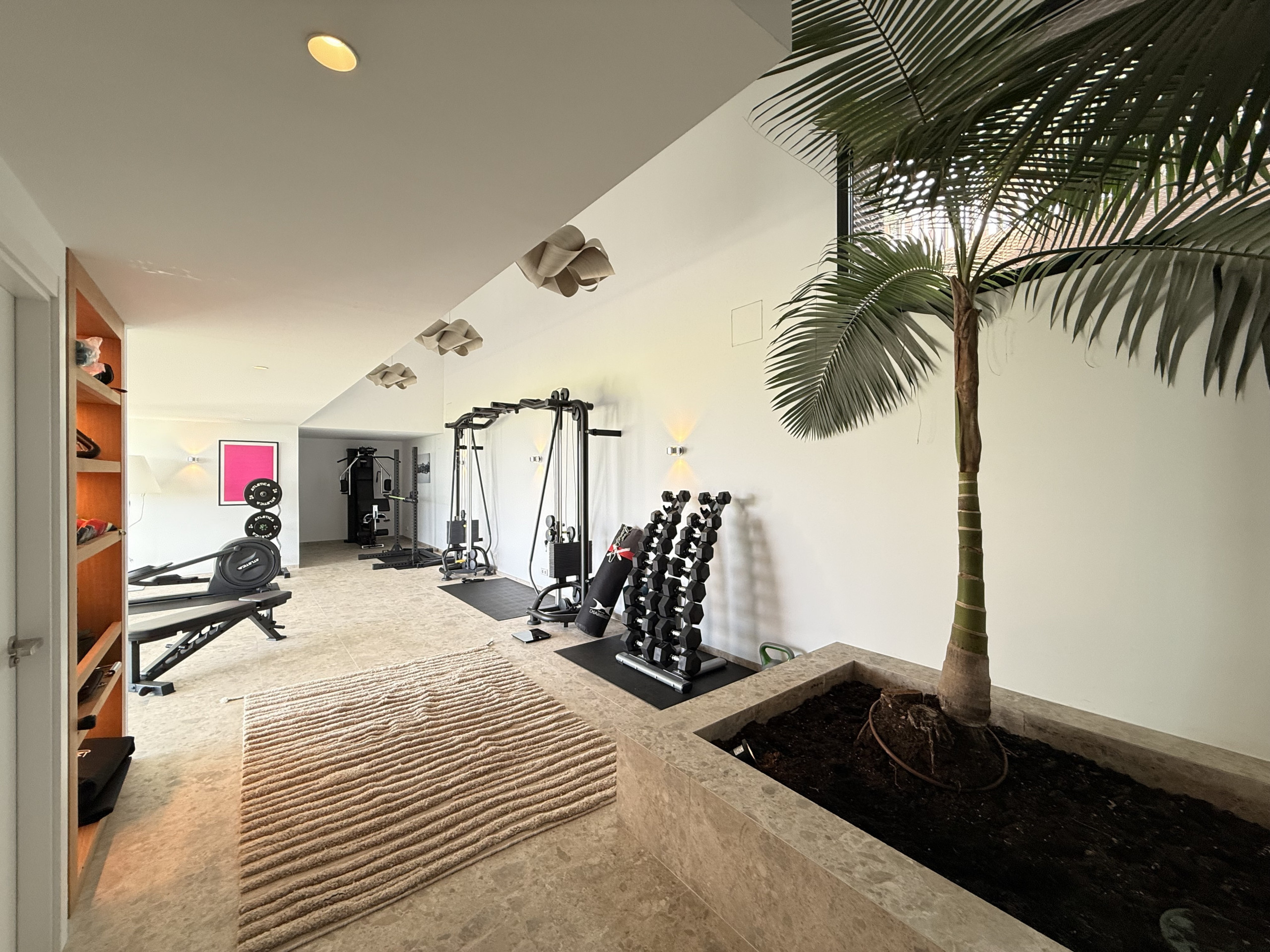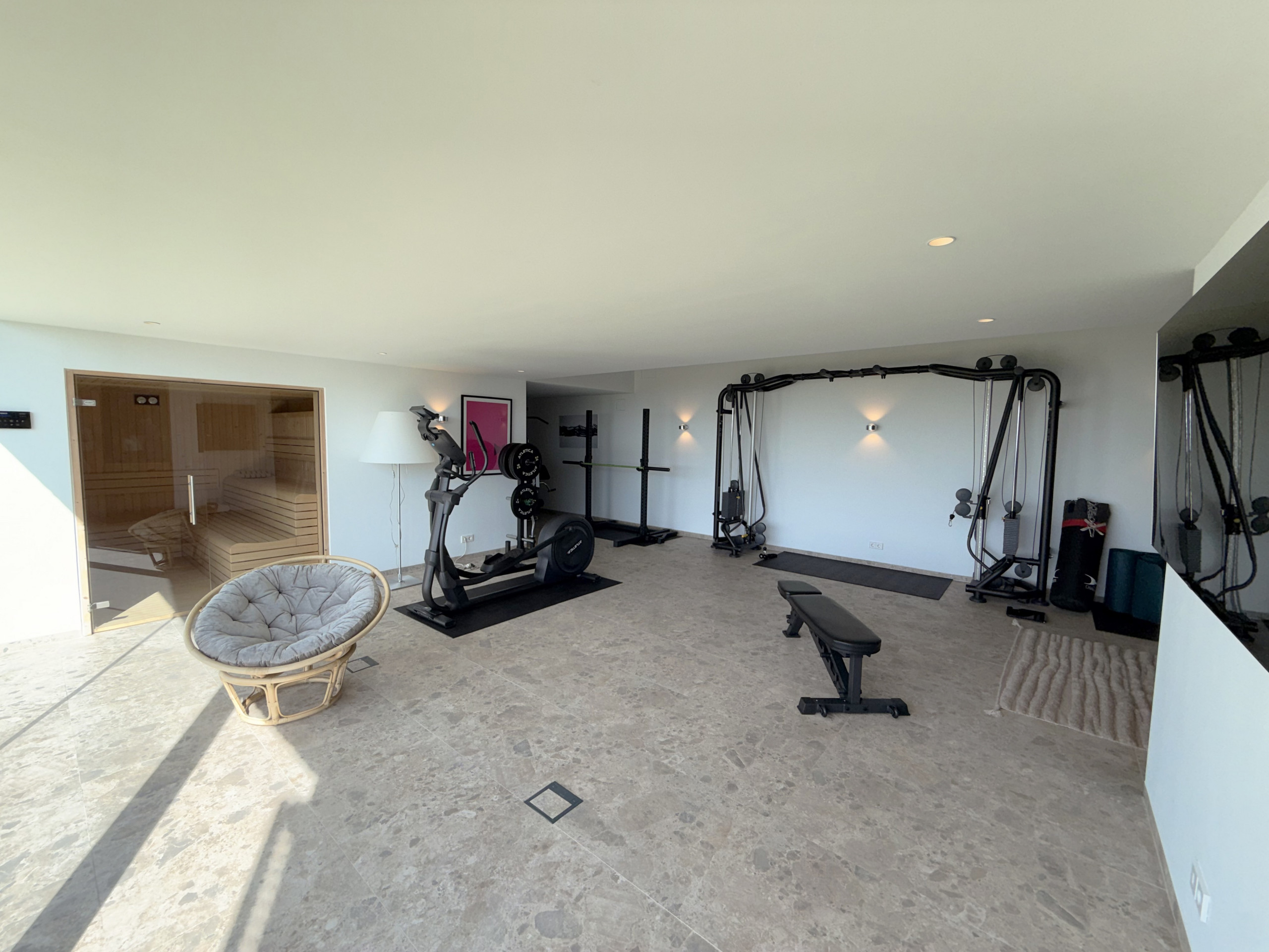 En el ala derecha al bajar la escalera, tras la zona de comedor y cocina, encontramos un pasillo que conduce a 2 dormitorios, que cuentan justo frente a los dormitorios con 2 baños con ducha, el pasillo finaliza en un espacio dedicado a la salud: un gimnasio totalmente equipado con máquinas de alta calidad y accesorios. Este espacio de bienestar incluye un lujoso baño con dos duchas y una gran sauna con vistas al mar. Junto al gimnasio, a través de unas escaleras llegamos al Dormitorio Principal, un refugio privado diseñado para el máximo descanso, el cual incluye área de trabajo, baño con ducha, bañera, vestidor y zona wc.