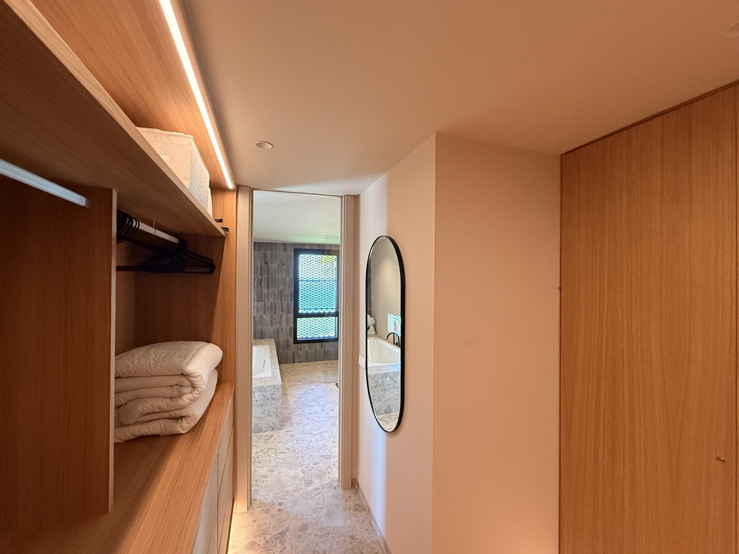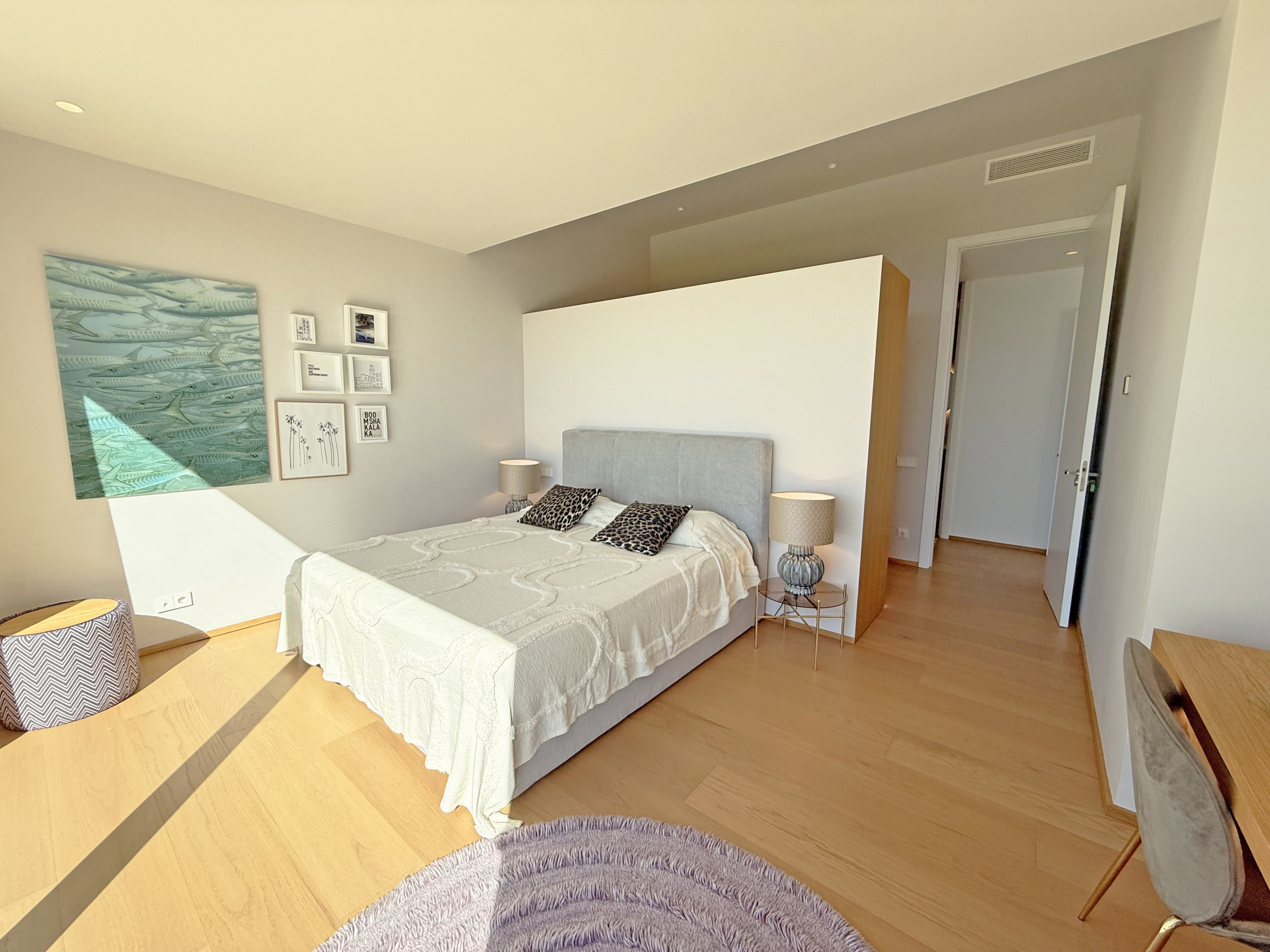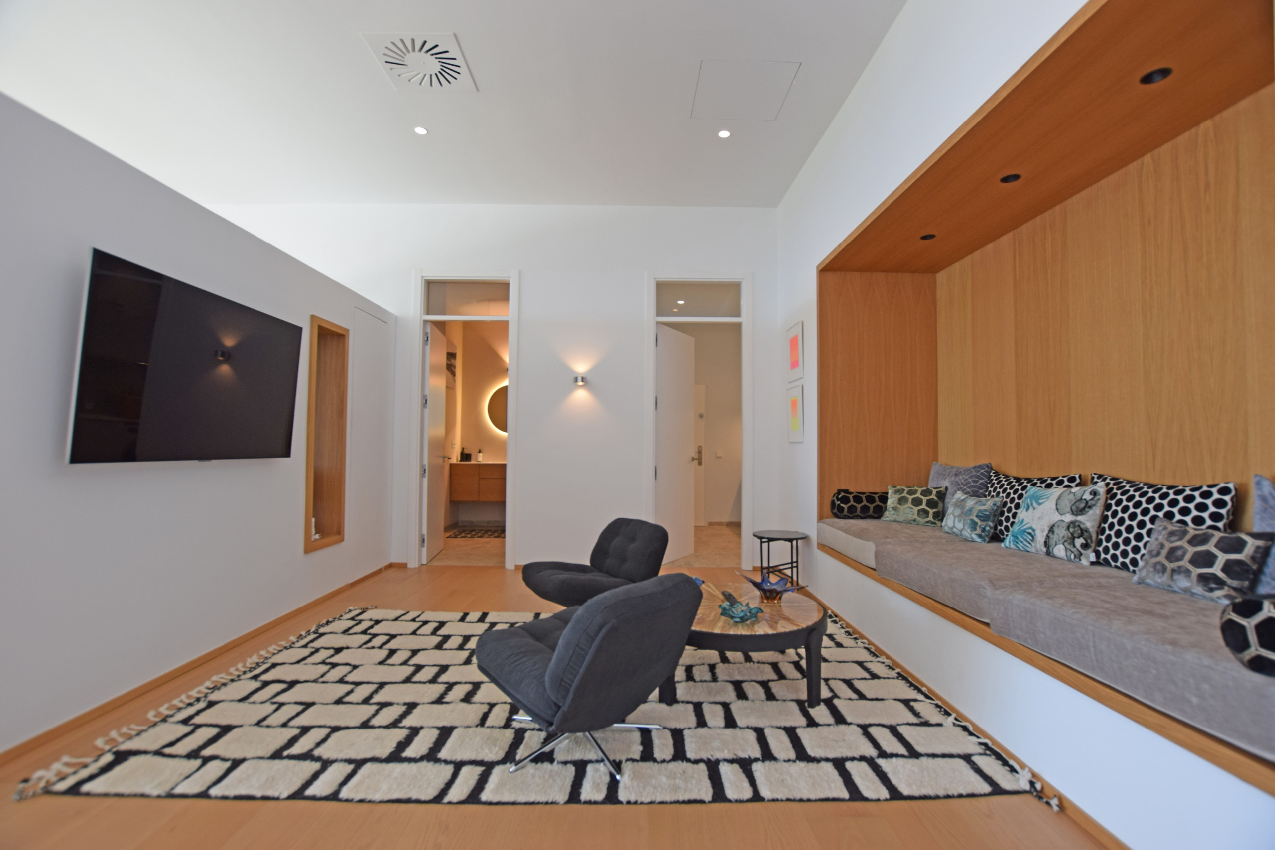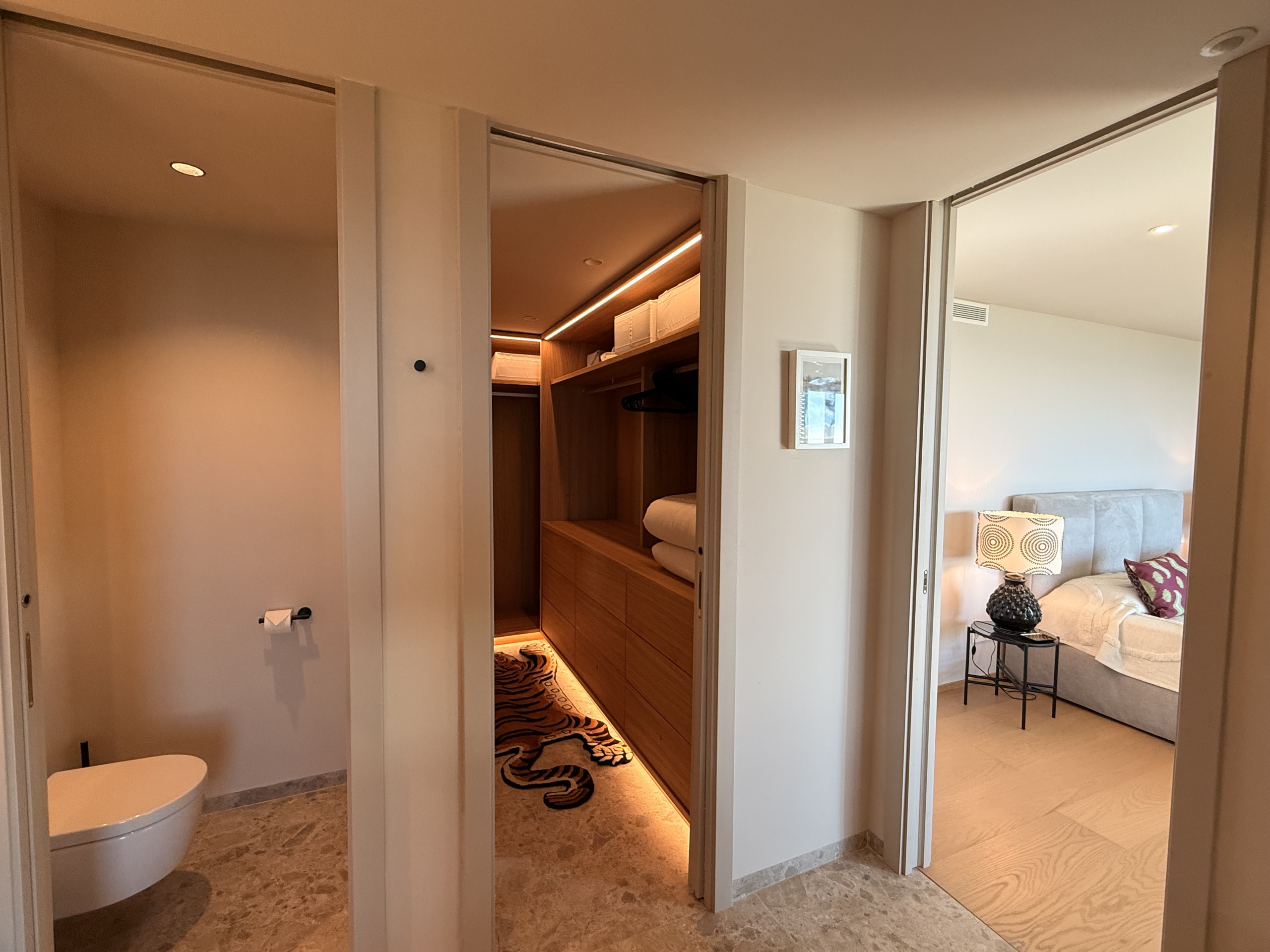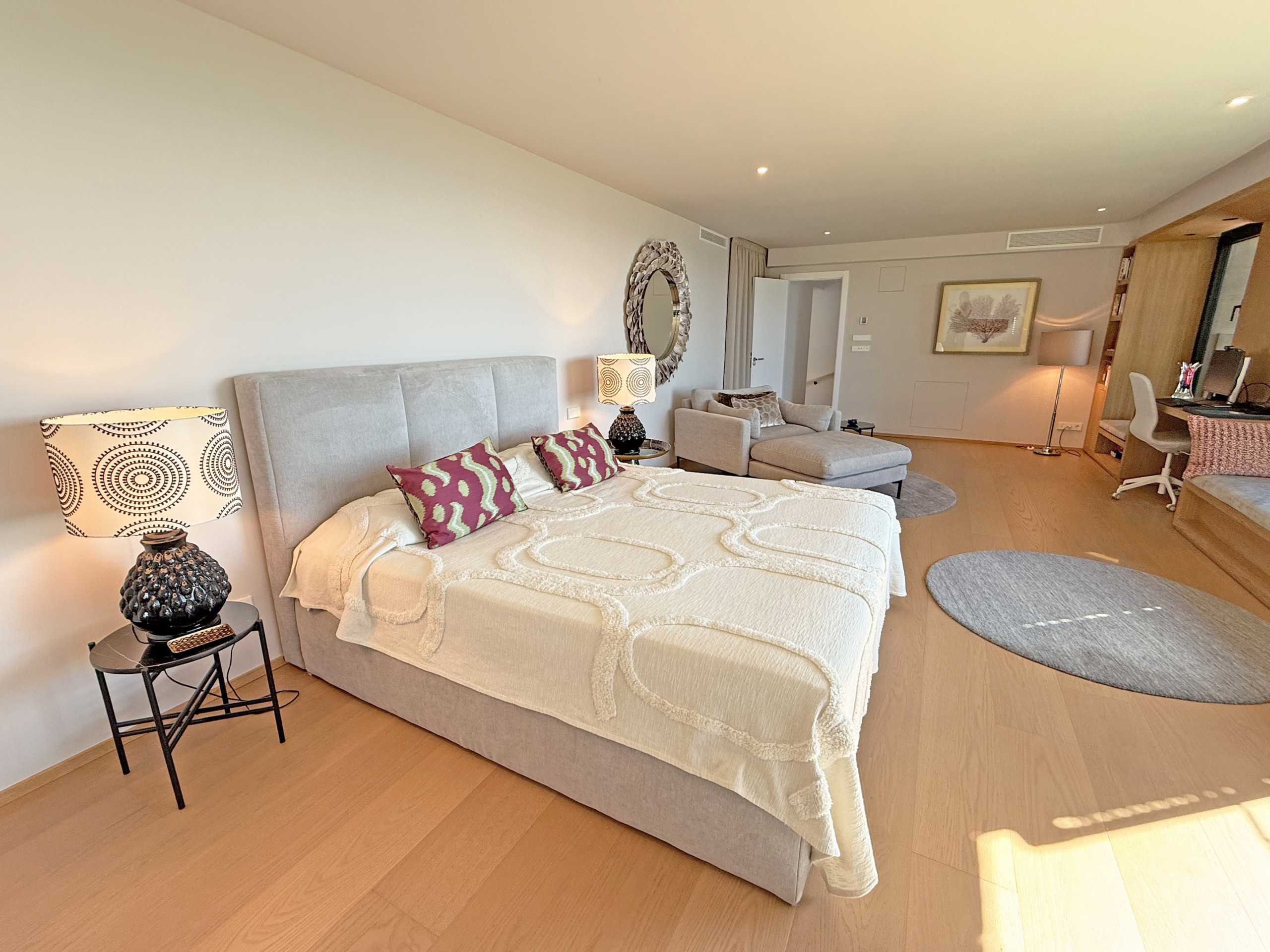 En el ala derecha al bajar la escalera, tras la zona de comedor y cocina, encontramos un pasillo que conduce a 2 dormitorios, que cuentan justo frente a los dormitorios con 2 baños con ducha, el pasillo finaliza en un espacio dedicado a la salud: un gimnasio totalmente equipado con máquinas de alta calidad y accesorios. Este espacio de bienestar incluye un lujoso baño con dos duchas y una gran sauna con vistas al mar. Junto al gimnasio, a través de unas escaleras llegamos al Dormitorio Principal, un refugio privado diseñado para el máximo descanso, el cual incluye área de trabajo, baño con ducha, bañera, vestidor y zona wc.