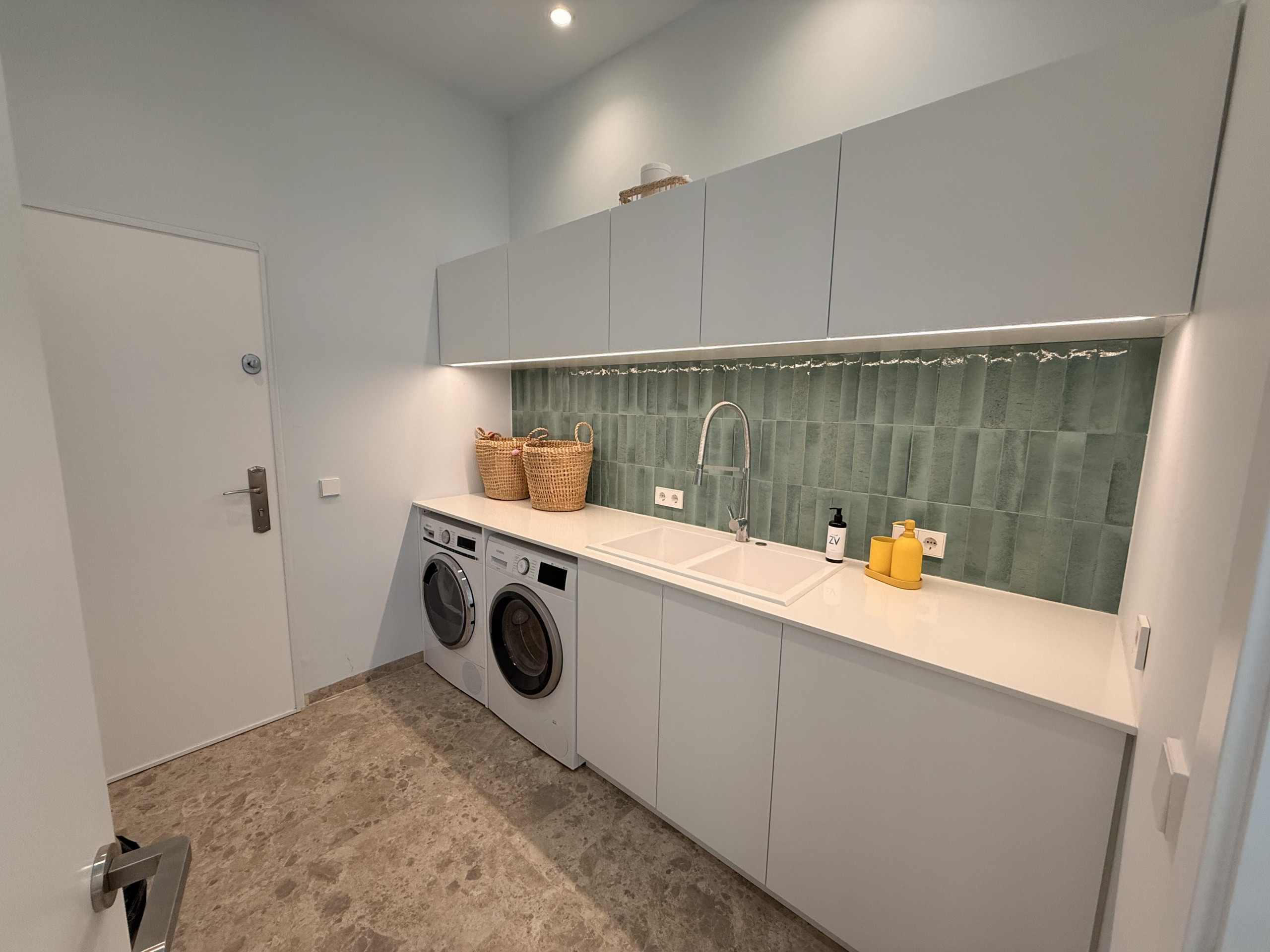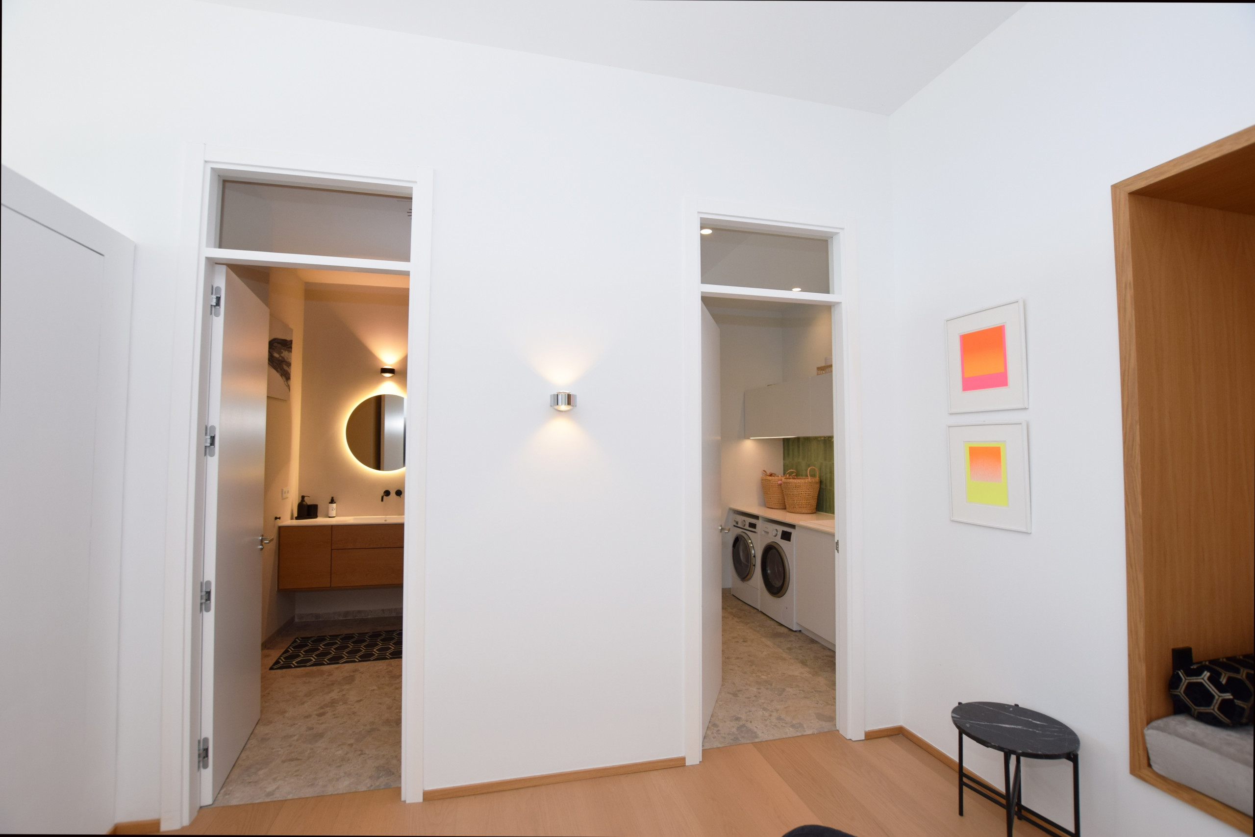 Zona de TV, Baño con ducha y Lavandería: Un área confortable para el entretenimiento y las tareas domésticas, con un baño completo adyacente.