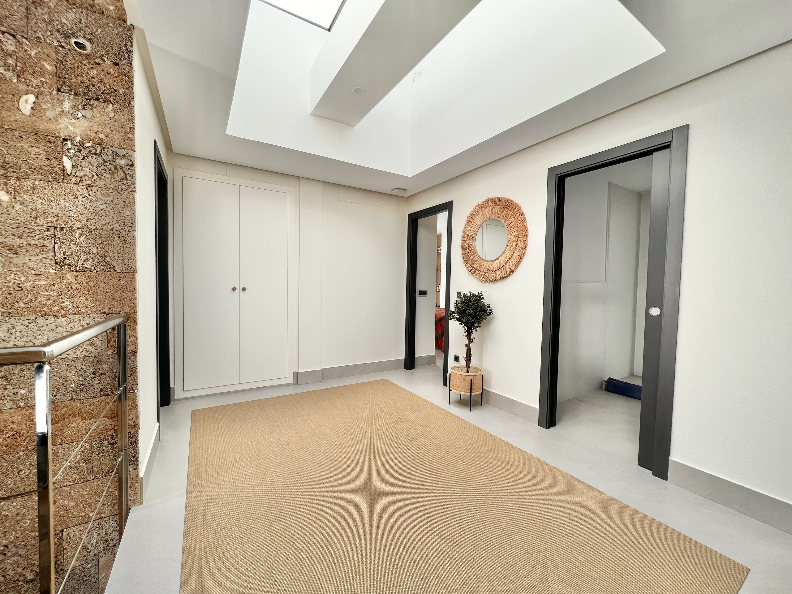 En la primera planta, a la que se accede por una elegante escalera de madera con paredes en piedra ostionera, encontrarás un distribuidor con luz natural que da paso al resto de los dormitorios de la propiedad. Dos de ellos tienen una cama individual, un tercero tiene dos camas individuales y la habitación principal cuenta con baño en-suite y acceso a una amplia y soleada terraza con vistas a la zona de piscina. A esta misma terraza tendría acceso el dormitorio con dos camas individuales que, además, también cuenta con baño en-suite. Esta planta dispone de un baño común que comparten las habitaciones simples.