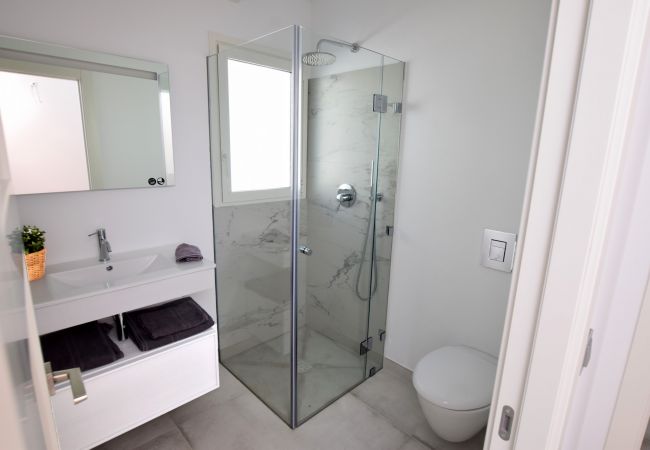 En primera planta se ubica el cuarto dormitorio, con cama doble y fantástico baño en suite con bañera exenta, plato de ducha, y gran terraza privada con panorámicas vistas a la zona de piscina y al Océano Atlántico.