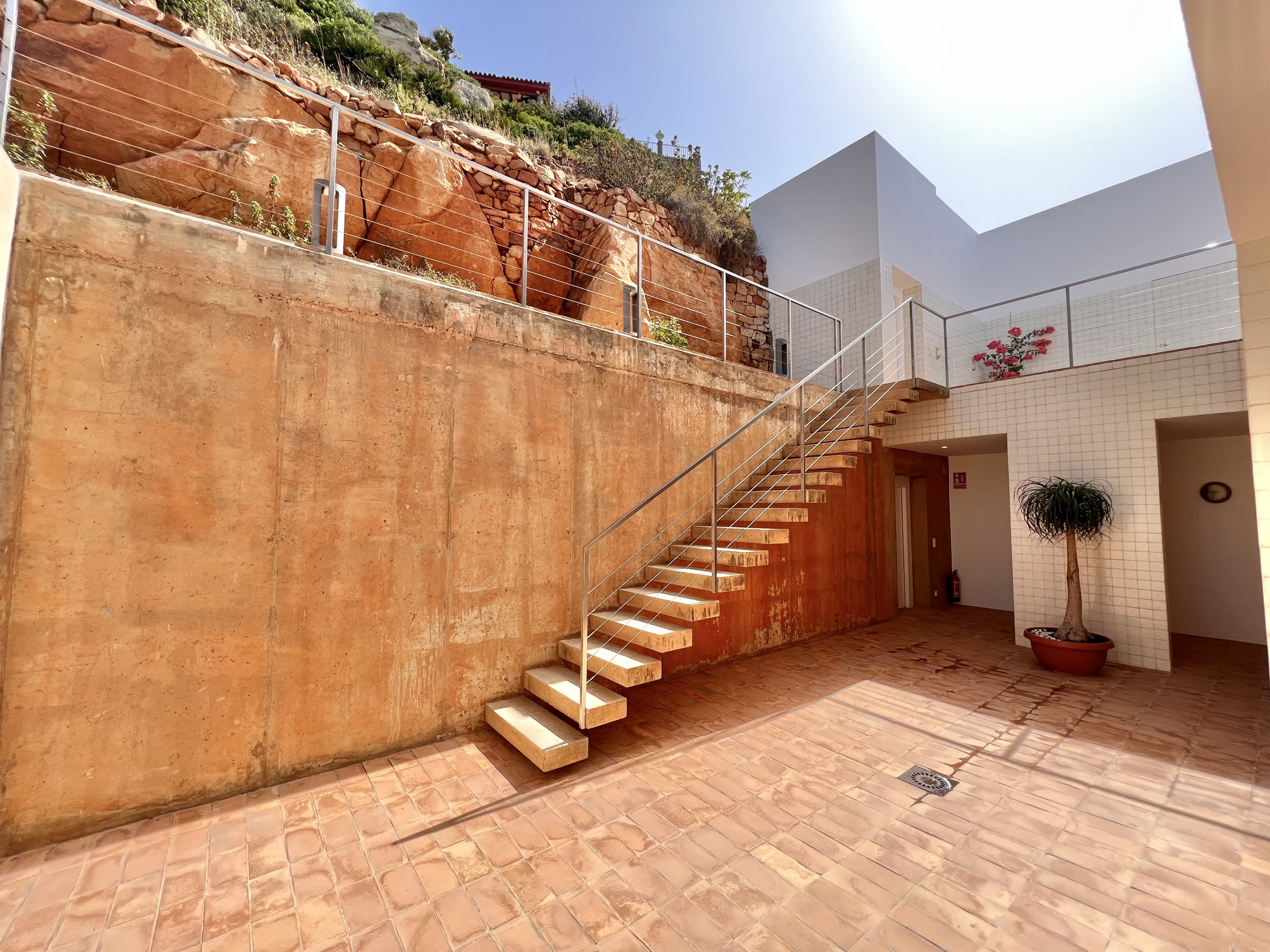 Sobre una gran plataforma (parcela de 2.690 m2 de y una superficie construida de 700 m2), orientada al Sur, se proyecta, más allá de la abrupta ladera, espacios diáfanos y transparentes, con tramos acristalados y muy protegida del sol directo mediante grandes vuelos, tanto en zonas interiores como exteriores. Aquí encontramos los espacios de uso diario, magnifico salón que conecta con las diferentes estancias; una maravillosa cocina con electrodomésticos Gaggenau Profesional y una gran isleta central con un equipamiento impecable, con una vitrocerámica con sistema Bulthaup B3 y placa teppan yaki, aquí el blanco de los muebles y encimera proporcionan una gran claridad, todo ello mezclado con el pavimento de auténtico barro cocido que le da calidez y confort; estudio con home cinema; aseo; almacén; gimnasio equipado con máquinas Hammeer Strentgh y Life Fitness con vistas abiertas al mar, con un área de ejercicio al aire libre, solárium, y en uno de los extremos una impresionante piscina desbordante climatizada con cloración salina.