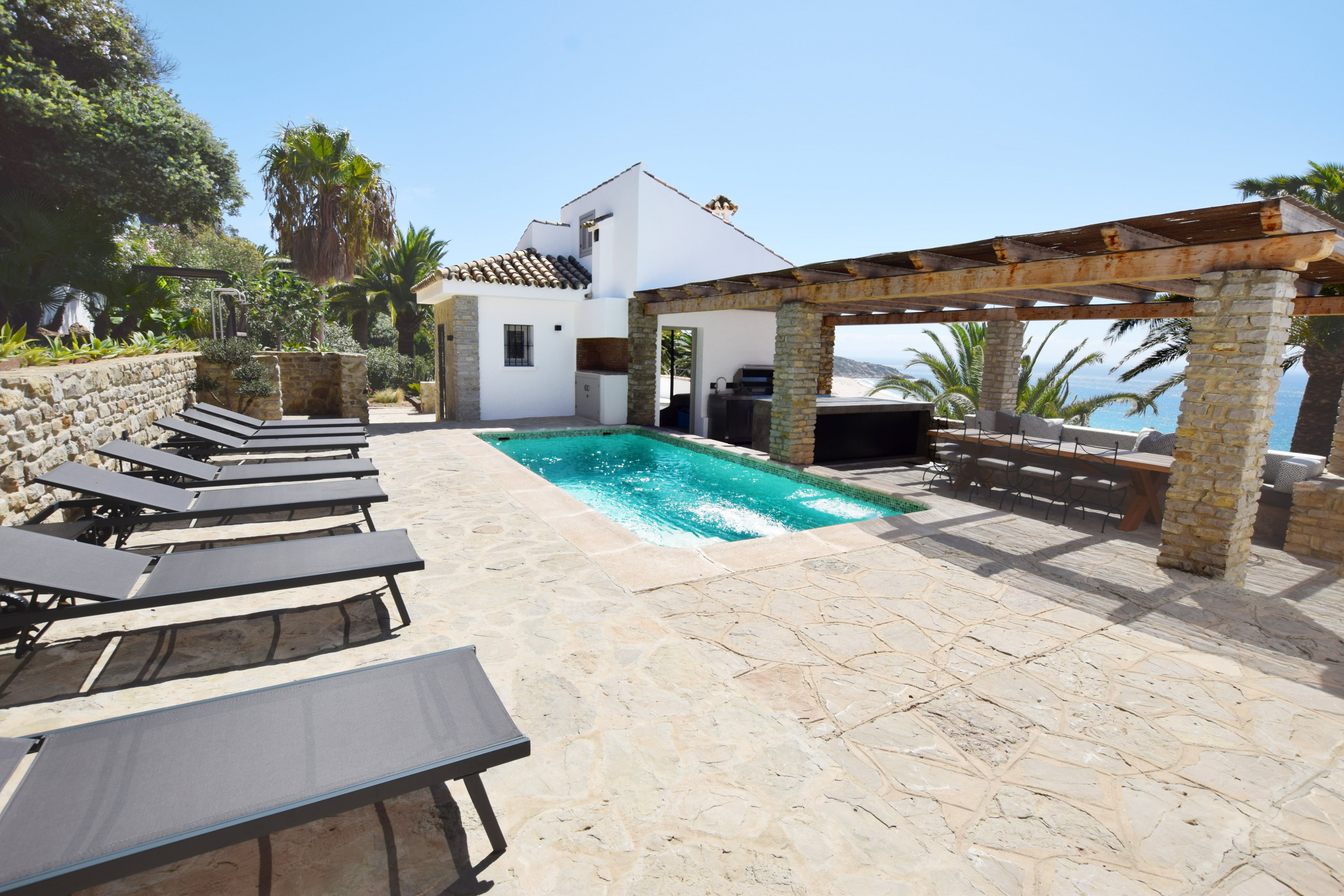 Al acceder hacia la zona de exterior, podremos disfrutar de un espacio completamente ideado para el relax: estupenda piscina, tumbonas para aprovechar el maravilloso sol del sur, ducha exterior, cama balinesa y un área de barbacoa con una gran mesa donde sentar a todos los comensales y así poder disfrutar de almuerzos y cenas al aire libre con espléndidas vistas al Faro de Camarinal.